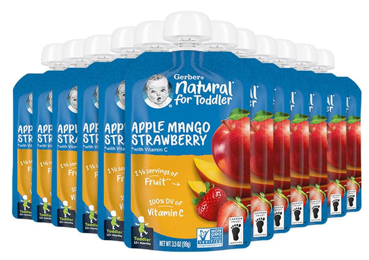 Twelve 3.5 oz pouches of Gerber Apple Mango Strawberry Toddler Food Gerber baby food helps...