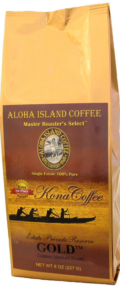 100% Pure Kona Coffee, Aloha Island Brand GOLD Medium Roast; a rich, well-rounded full-bodied flavor...