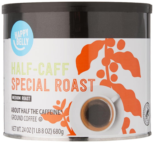 Amazon Brand - Happy Belly Half Caffeine Canister Ground Coffee, Medium Roast, 1.5 Pound (Pack Of 1)
