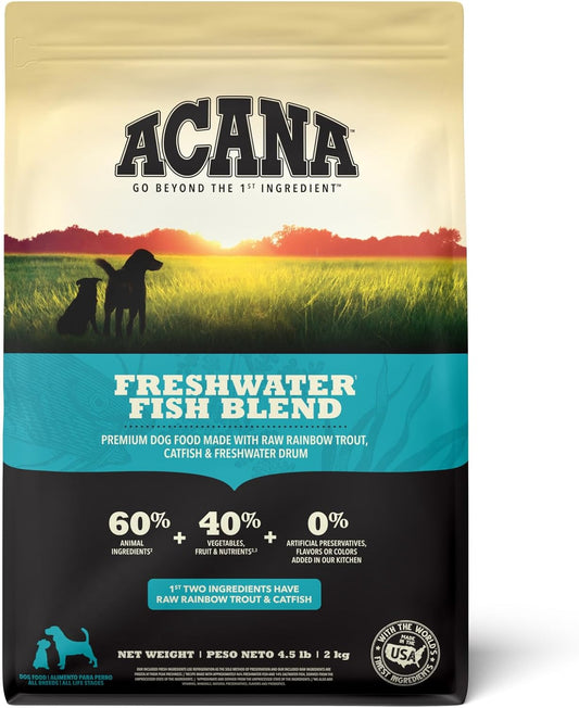 One (1) 4.5 lb bag of ACANA Grain Free* Freshwater Fish Recipe Dry Dog Food10High...