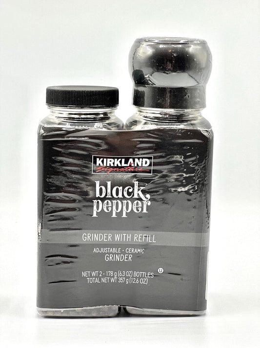 Description Includes: Pack of 2 Kirkland Signature Whole Black Peppercorns, Adjustable Ceramic Grinder. 6.3 oz...