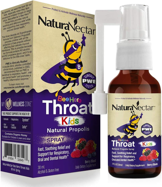 NaturaNectar Exclusive Kids Propolis Throat Spray, BeeHero Berry Blast Flavor