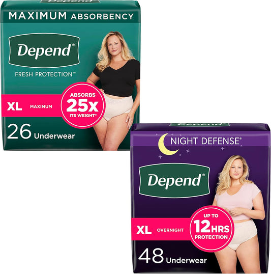 NEW LOOK! Bundle Includes: Depend Fresh Protection Incontinence Underwear for Women, 26ct, and Depend Night...