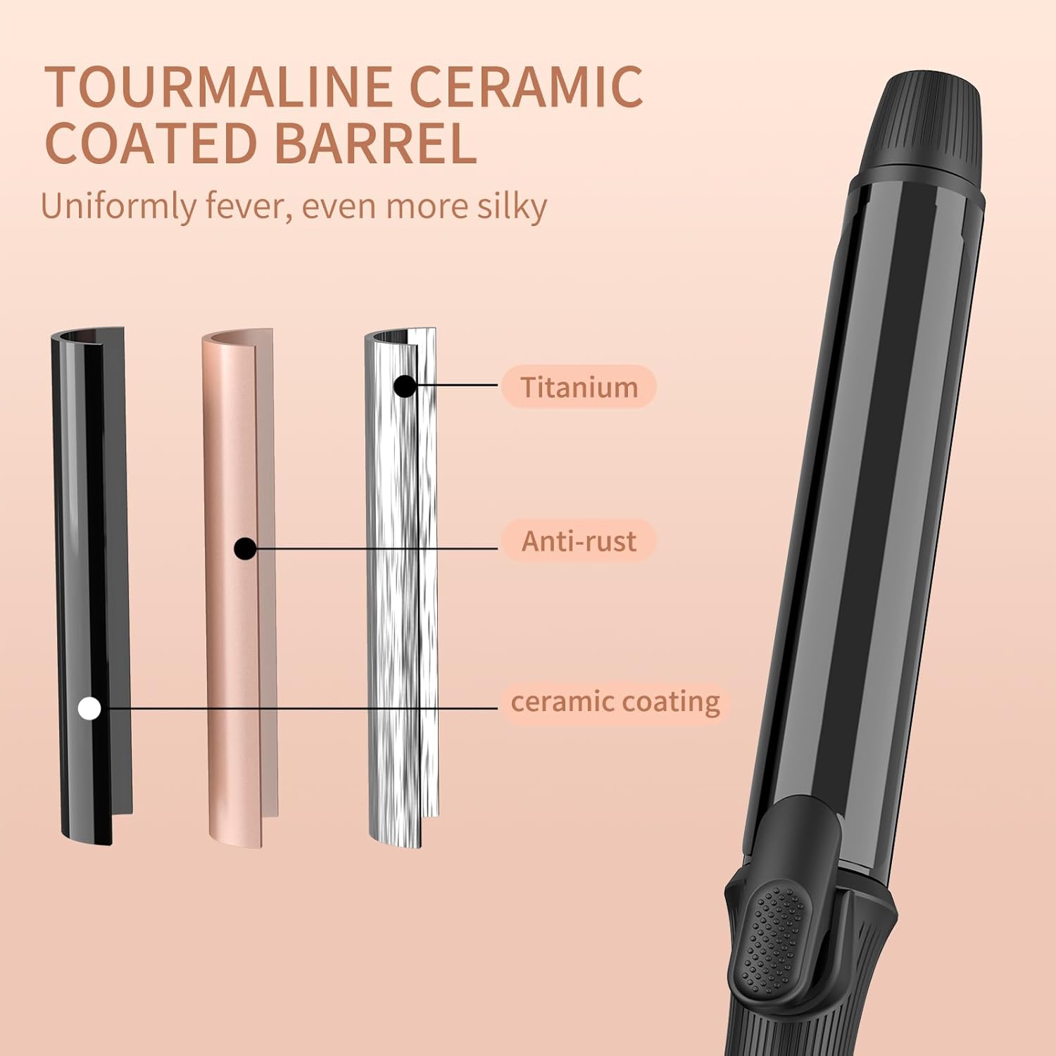 About this item Tourmaline Ceramic Technology Curling WandK&K 1 1/4 inch curling iron with a ceramic-coated barrel seals in hair moisture and protects cuticles with minimal frizz and damage. The non-stick ceramic surface effortlessly glides through hair, leaving behind long-lasting, shiny tight curls and natural-looking ringlets. MULTIPLE Temperature Settings & LCD DisplayThe curling wand has different temperature settings from 122°F to 450°F. Whether your hair is hard or soft, coarse or sleek, you can choose the right temperature to create your hairstyle. The hair curling wand is equipped with an LCD display screen, which can display the real-time temperature during the heating process. 30s Fast HeatingThe hair curling iron adopts MCH heating technology, which has a high electrothermal conversion rate and can be quickly heated to 450°F in 30s. Greatly reduce your waiting time. Safety & Easy to UseOur barrel curling iron features a lightweight and ergonomic handle, ensuring easy and comfortable hair styling. Designed with an anti-scald top and a 360° tangle-free cable, it offers enhanced safety and convenience, guarding against accidental burns. Moreover, it comes with a heat-resistant glove, 2 clips, and a comb, ensuring multiple layers of protection for worry-free and convenient use. 110V -220V WORLDWIDE VOLTAGEDual voltage design allows you to use the hair curler while traveling; 360° swivel power cord (8.2ft) give you freedom to adjust the hair curling iron, and comfortably style your hair at any angle. See more product details,Tourmaline Ceramic Technology Curling WandK&K 1 1/4 inch curling iron with a ceramic-coated barrel seals in hair moisture and protects cuticles with minimal frizz and damage. The non-stick ceramic surface effortlessly glides through hair, leaving behind long-lasting, shiny tight curls and natural-looking ringlets,MULTIPLE Temperature Settings & LCD DisplayThe curling wand has different temperature settings from 122°F to 450°F. Whether your hair is hard or soft, coarse or sleek, you can choose the right temperature to create your hairstyle. The hair curling wand is equipped with an LCD display screen, which can display the real-time temperature during the heating process,30s Fast HeatingThe hair curling iron adopts MCH heating technology, which has a high electrothermal conversion rate and can be quickly heated to 450°F in 30s. Greatly reduce your waiting time,Safety & Easy to UseOur barrel curling iron features a lightweight and ergonomic handle, ensuring easy and comfortable hair styling. Designed with an anti-scald top and a 360° tangle-free cable, it offers enhanced safety and convenience, guarding against accidental burns. Moreover, it comes with a heat-resistant glove, 2 clips, and a comb, ensuring multiple layers of protection for worry-free and convenient use,110V -220V WORLDWIDE VOLTAGEDual voltage design allows you to use the hair curler while traveling; 360° swivel power cord (8.2ft) give you freedom to adjust the hair curling iron, and comfortably style your hair at any angle