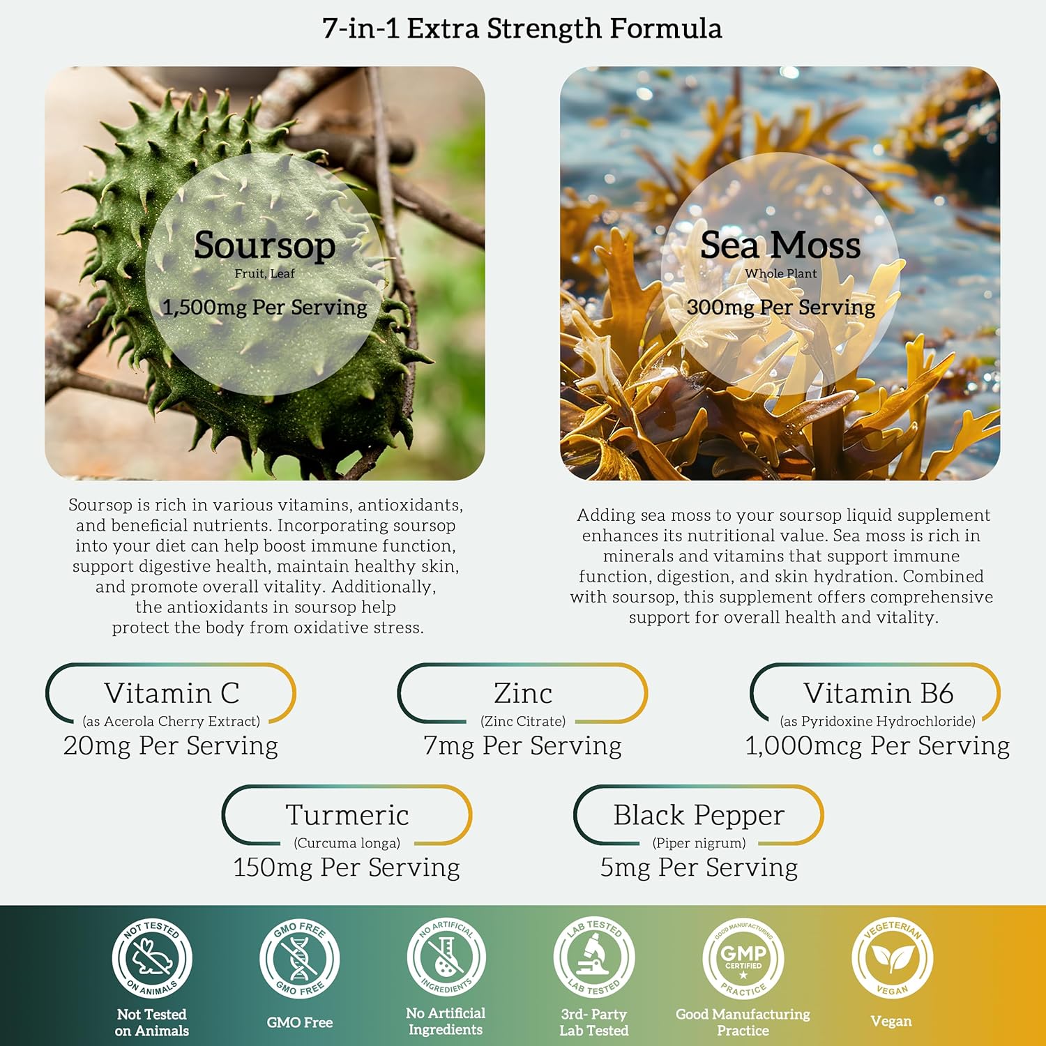 About this item What is SoursopSoursop, also known as Graviola or Guanabana, is a tropical fruit rich in vitamin C, B1, B2, essential minerals, and dietary fiber. It has various uses in folklore, offering potential health benefits such as antioxidative and immune-boosting properties. 1 Pack Soursop Organic Liquid DropsOur organic soursop graviola drops are extracted from the essence of soursop leaves, offering potential antioxidant benefits to help reduce oxidative stress on the body. They may also provide support for immune system function, aid in digestive comfort, and contribute to healthy-looking skin. 7 In 1 Extra StrengthOur soursop bitters drops are enriched with trace amounts of Vitamin B6, C, and Zinc, along with extracts from three herbal plants (Sea Moss, Turmeric, Black Pepper). This carefully crafted formulation is designed to complement your health regimen and enhance the potential benefits of soursop drops. Easy to UseLiquid drops offer superior bioavailability compared to tablets, capsules, tea, and pills, facilitating easier absorption of the active ingredients by the body. Shake well before use. For oral consumption, take 2 ml daily, preferably after meals. These drops taste tangy-sweet with a subtle hint of bitterness. If the taste is not preferred, they can be added to pure water, tea, coffee, salads, or other beverages and foods for convenience. Pure and Transparent NutritionOur products are free from artificial colors, flavors, added sugars, and common allergens such as soy, nuts, peanuts, and dairy. They are gluten-free, gelatin-free, non-GMO, and suitable for vegetarians. Our soursop drops are manufactured in GMP-certified facilities. If you have any questions upon receipt, please feel free to contact us. We are available 24/7 to assist you! (Individuals with allergies to seaweed, pepper, and ginger are advised to use with caution) See more product details,What is SoursopSoursop, also known as Graviola or Guanabana, is a tropical fruit rich in vitamin C, B1, B2, essential minerals, and dietary fiber. It has various uses in folklore, offering potential health benefits such as antioxidative and immune-boosting properties,1 Pack Soursop Organic Liquid DropsOur organic soursop graviola drops are extracted from the essence of soursop leaves, offering potential antioxidant benefits to help reduce oxidative stress on the body. They may also provide support for immune system function, aid in digestive comfort, and contribute to healthy-looking skin,7 In 1 Extra StrengthOur soursop bitters drops are enriched with trace amounts of Vitamin B6, C, and Zinc, along with extracts from three herbal plants (Sea Moss, Turmeric, Black Pepper). This carefully crafted formulation is designed to complement your health regimen and enhance the potential benefits of soursop drops,Easy to UseLiquid drops offer superior bioavailability compared to tablets, capsules, tea, and pills, facilitating easier absorption of the active ingredients by the body. Shake well before use. For oral consumption, take 2 ml daily, preferably after meals. These drops taste tangy-sweet with a subtle hint of bitterness. If the taste is not preferred, they can be added to pure water, tea, coffee, salads, or other beverages and foods for convenience,Pure and Transparent NutritionOur products are free from artificial colors, flavors, added sugars, and common allergens such as soy, nuts, peanuts, and dairy. They are gluten-free, gelatin-free, non-GMO, and suitable for vegetarians. Our soursop drops are manufactured in GMP-certified facilities. If you have any questions upon receipt, please feel free to contact us. We are available 24/7 to assist you! (Individuals with allergies to seaweed, pepper, and ginger are advised to use with caution)
