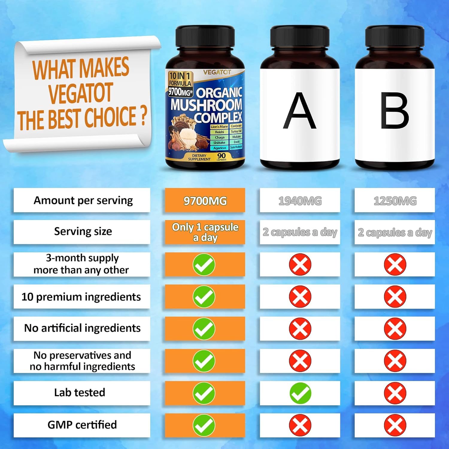 BULLET POINTS : 1 > HIGHEST POTENCY: With just 1 convenient capsule, you'll get all the potent of 10 top tier mushrooms highly concentrated into this 10 in 1 formula. Say goodbye to juggling multiple mushroom supplements - Vegatot Mushroom Complex is all you need to perform at your best
