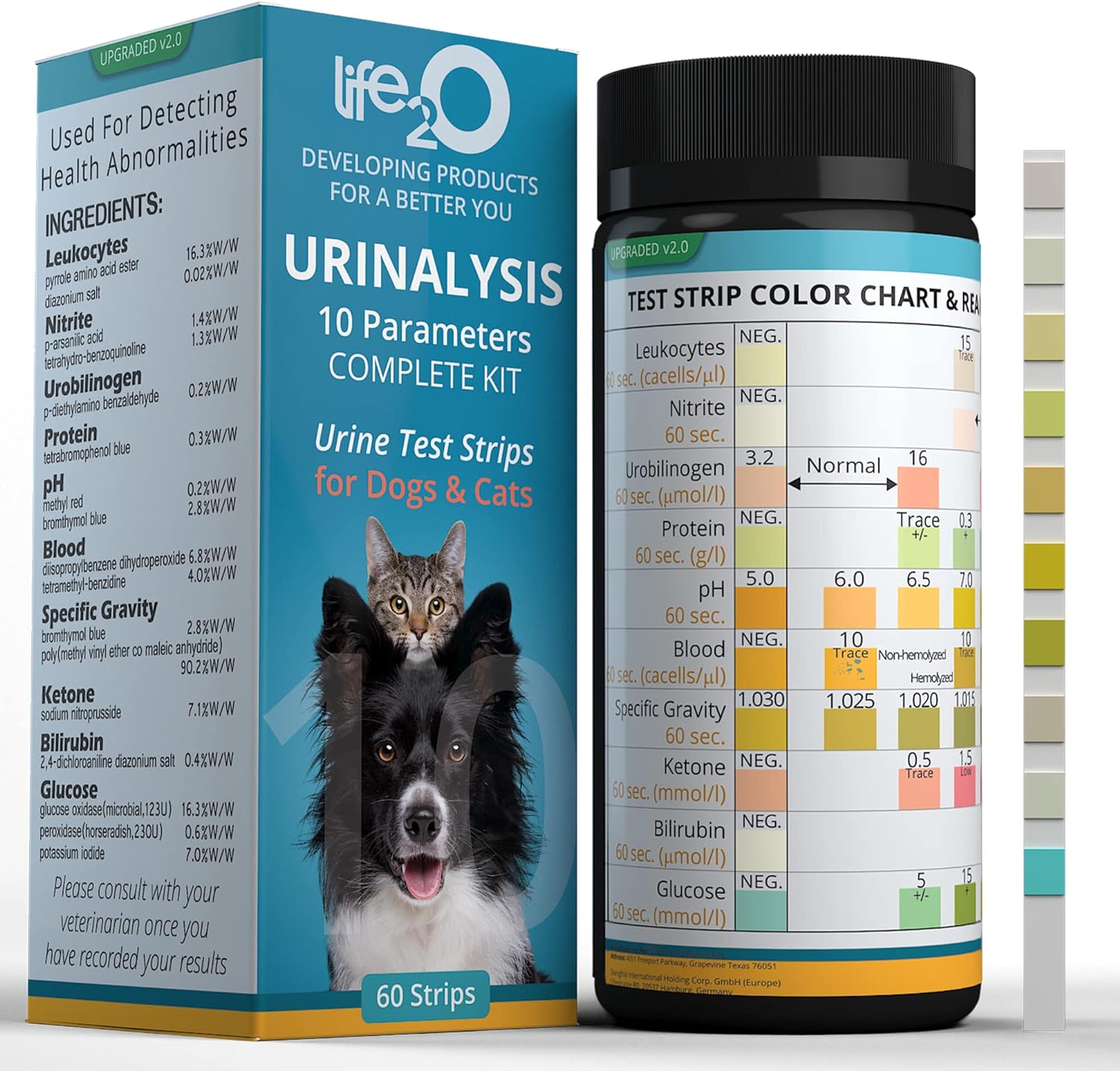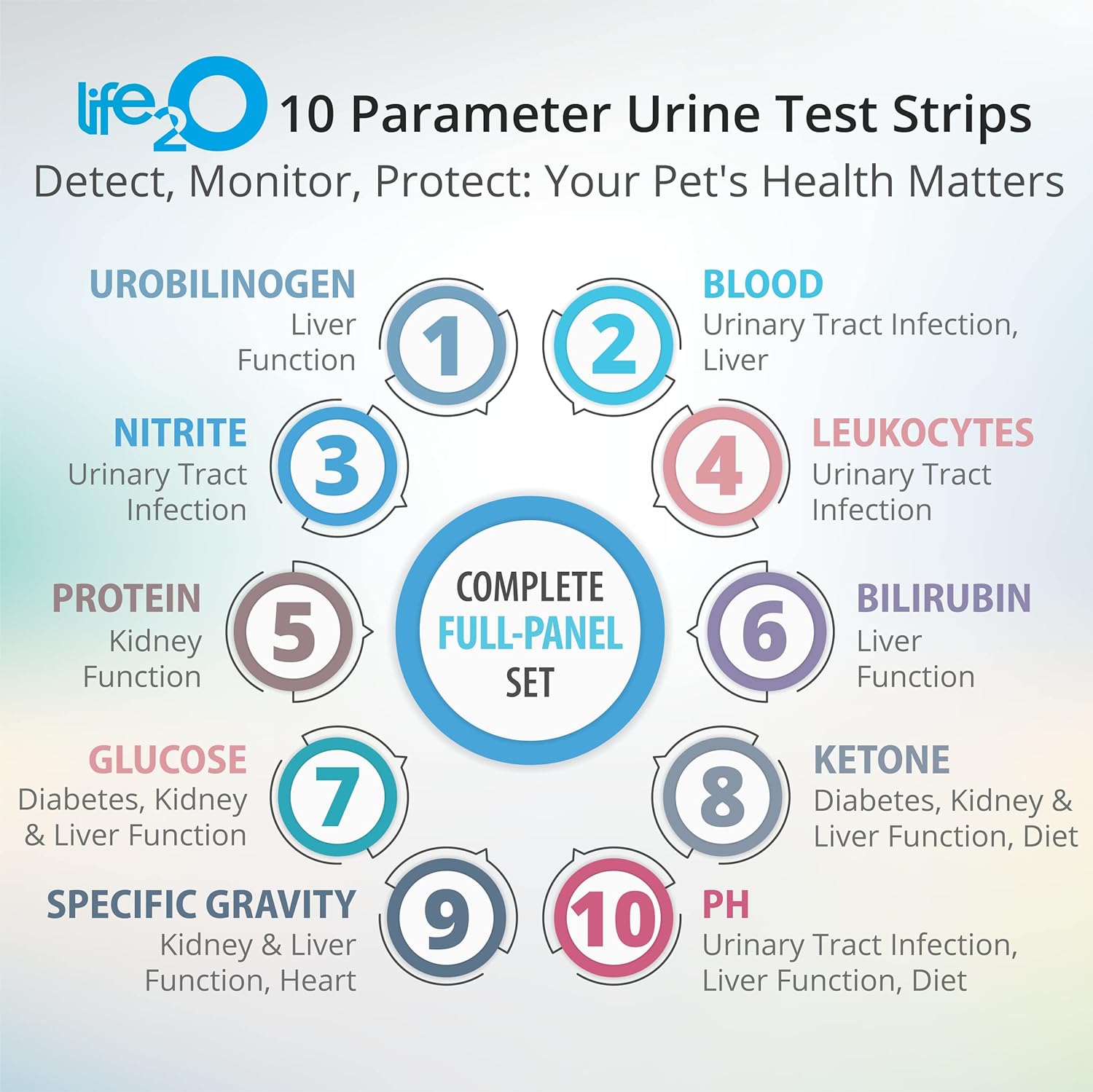 [10-PARAMETER FULL-PANEL PET URINE TEST] Leukocytes, Nitrite, Urobilinogen, Protein, pH, Blood, Specific Gravity, Ketone, Bilirubin, Glucose10[TRUSTED BY VETS] Manage your petās disease or perform a routine check-up for kidney & liver disease, urinary tract infection (UTI), dehydration, diabetes, metabolic disorders and more10[URINE COLLECTION] Not sure how to collect your petās urine Search on Amazon for ādog urine collectorā or ānon-absorbent cat litterā10[INSTANT RESULTS] Simple, user-friendly instructions with color chart & visual results in 60 seconds10