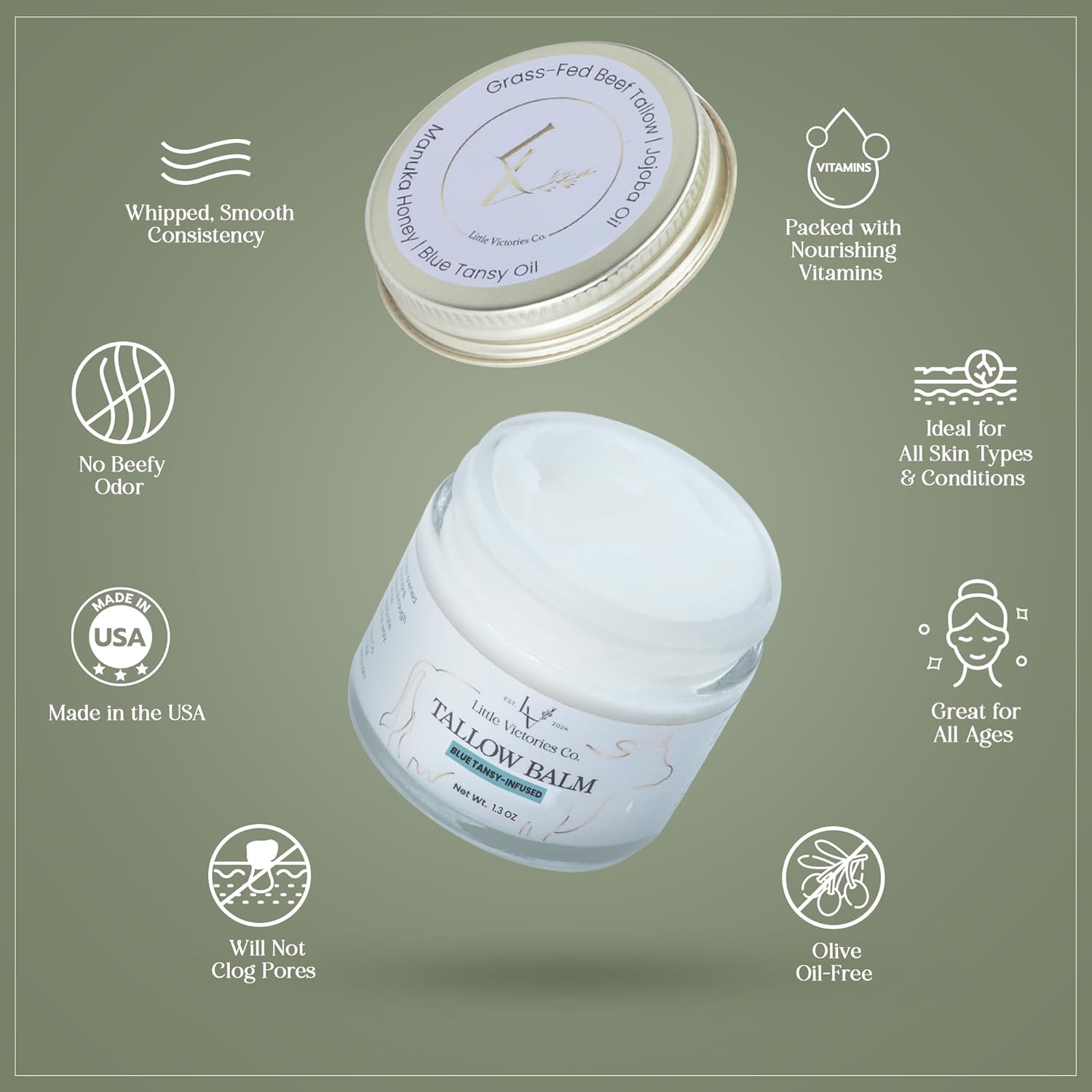 About this item Back to Your Best Glow - This tallow honey balm restores bounce, smooths away signs of stress, and gives your skin the glow it was born to have. Full of the Good Stuff â This organic beef tallow balm is naturally full of vitamins A, D, E & K to help hydrate dry skin, soften texture, and bring back your skinâs natural stretch and glow. Quench Your SkinâOnce and Done - Ever feel great in the morning, only to dry out by lunchtime Not anymore. Our beef tallow for face is Lavender Scented and built to lastâgiving your skin the lasting hydration it craves without the greasy feel. Moisture That Means It - Skin thrives on the right kind of fat. Thatâs why we use tallow balm for skin - loaded with vitamins and nutrients your skin will soak up like a sponge. The honey Just an extra little love. Grandma Was Right - Long before the aisles were packed with mystery creams, people just used tallowâand it actually worked. Simple, natural, and skin-approved for generations. Skin Drama, Solved - Hormones, weather, babiesâwhateverâs got your skin stressed, this beef tallow face balm smooths it over. Made with pure grass-fed beef tallow, it softens dry patches, calms eczema, and helps stretch marks fade into the background. Basically, itâs like giving your skin a pep talk (with snacks). âș See more product details,Back to Your Best Glow - This tallow honey balm restores bounce, smooths away signs of stress, and gives your skin the glow it was born to have,Full of the Good Stuff â This organic beef tallow balm is naturally full of vitamins A, D, E & K to help hydrate dry skin, soften texture, and bring back your skinâs natural stretch and glow,Quench Your SkinâOnce and Done - Ever feel great in the morning, only to dry out by lunchtime Not anymore. Our beef tallow for face is Lavender Scented and built to lastâgiving your skin the lasting hydration it craves without the greasy feel,Moisture That Means It - Skin thrives on the right kind of fat. Thatâs why we use tallow balm for skin - loaded with vitamins and nutrients your skin will soak up like a sponge. The honey Just an extra little love,Grandma Was Right - Long before the aisles were packed with mystery creams, people just used tallowâand it actually worked. Simple, natural, and skin-approved for generations,Skin Drama, Solved - Hormones, weather, babiesâwhateverâs got your skin stressed, this beef tallow face balm smooths it over. Made with pure grass-fed beef tallow, it softens dry patches, calms eczema, and helps stretch marks fade into the background. Basically, itâs like giving your skin a pep talk (with snacks)