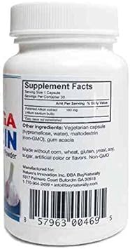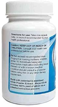 Mega Allicin capsules each contain over 180,000mcg/180mg - 90 vCaps (Vegetarian Capsules) of patented and scientifically proven allicin powder, one of natureās most well-known agents used for centuries to support natural health and well-being. Experience the Power of Allicin: Allicin, garlic's active ingredient (derrived from allium sativum) known for boosting the immune, circulatory systems and improving gut health, naturally. Our allicin is extracted in a patented proprietary method from freshly crushed garlic cloves. Our formula secures 180,000 mcg/180mg of allicin in each vegetarian capsule, preserving its potency. MEGA ALLICIN is odor-controlled, 100% Natural and Non-Toxic; encapsulated with a Vegetarian capsule. It is made WITHOUT corn, wheat, gluten, yeast, soy, sugar, artificial colors, or flavors. This product is non-GMO