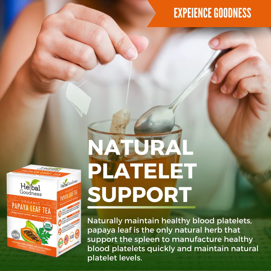 ?? Naturally Boosts Blood Platelets - Papaya leaf tea also contains the enzyme Fibrin which acts naturally to provide blood platelet support by helping to improve white blood cell function10?? Digestion Support - As a natural herbal tea, it’s packed with the digestive enzymes papain which aids digestion and improves your overall health, and helps restore intestinal flora10?? Skin Support - Papaya leaves aid in cell regeneration and free radical suppression and slow down the process of aging, which helps promote healthy, glowing skin10?? Steep this tea to obtain wholesome papaya leaf tea extract that is high in fiber and provides an energy boost. We pay fair market value to our Papaya farmers, and only select the highest quality, organic certified GMO-free papaya leaves available10?? 100% Pure Papaya Leaf Tea - Our tea bags are made using 100% pure organic, gluten free papaya leaves, containing no fillers, additives, preservatives or sweeteners10