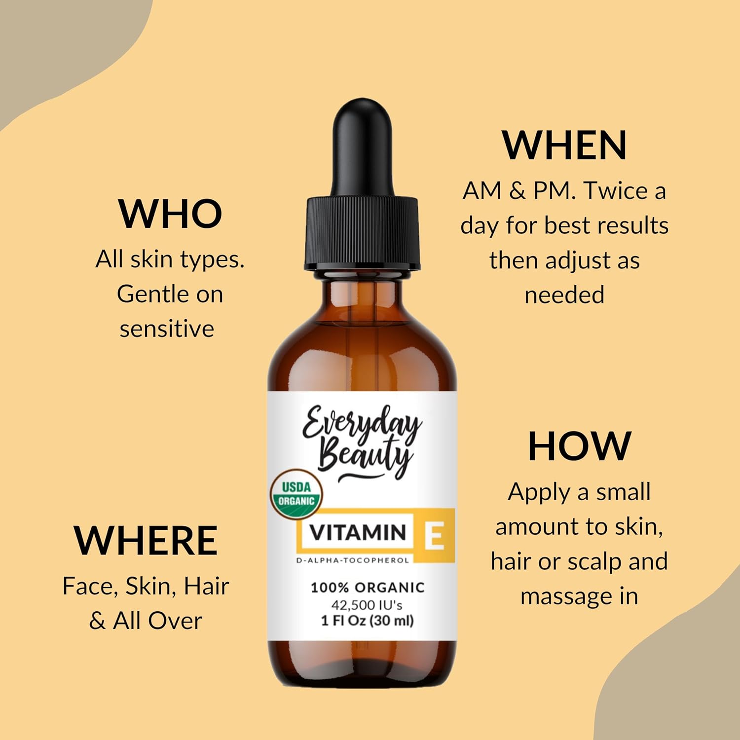 About this item 100% Organic USDA Certified All Natural and Pure Vitamin E - D-Alpha Tocopherol. Plant Based, Vegan, Cruelty-Free 100% USDA Certified Organic Means Non GMO, No Chemicals, No Pesticides and the Highest Standard which in the end means the safest product for you. Being 100% Organic also makes it ideal in other organic beauty formulations. Hydrate and Moisturize Your Skin, Hair & Nails Naturally - NO Perfume, NO Fragrance, NO Mineral Oil, NO Petroleum and NO Cheap Fillers or Preservatives. Simply Using Mother Natures Finest Ingredients to Help Hydrate and Moisturize Your Body Your Purchase Empowers Small Businesses: When you choose our 100% Organic Vitamin E Oil, you're not just purchasing a skincare product; you're investing in your beauty, well-being, and the growth of small businesses. 1 Fl Oz Glass Amber Bottle & Glass Dropper is BPA Free, Sealed for Safety & Freshness - Always Apply a Test Patch Before Regular Use See more product details,100% Organic USDA Certified All Natural and Pure Vitamin E - D-Alpha Tocopherol. Plant Based, Vegan, Cruelty-Free,100% USDA Certified Organic Means Non GMO, No Chemicals, No Pesticides and the Highest Standard which in the end means the safest product for you. Being 100% Organic also makes it ideal in other organic beauty formulations,Hydrate and Moisturize Your Skin, Hair & Nails Naturally - NO Perfume, NO Fragrance, NO Mineral Oil, NO Petroleum and NO Cheap Fillers or Preservatives. Simply Using Mother Natures Finest Ingredients to Help Hydrate and Moisturize Your Body,Your Purchase Empowers Small Businesses: When you choose our 100% Organic Vitamin E Oil, you're not just purchasing a skincare product; you're investing in your beauty, well-being, and the growth of small businesses,1 Fl Oz Glass Amber Bottle & Glass Dropper is BPA Free, Sealed for Safety & Freshness - Always Apply a Test Patch Before Regular Use