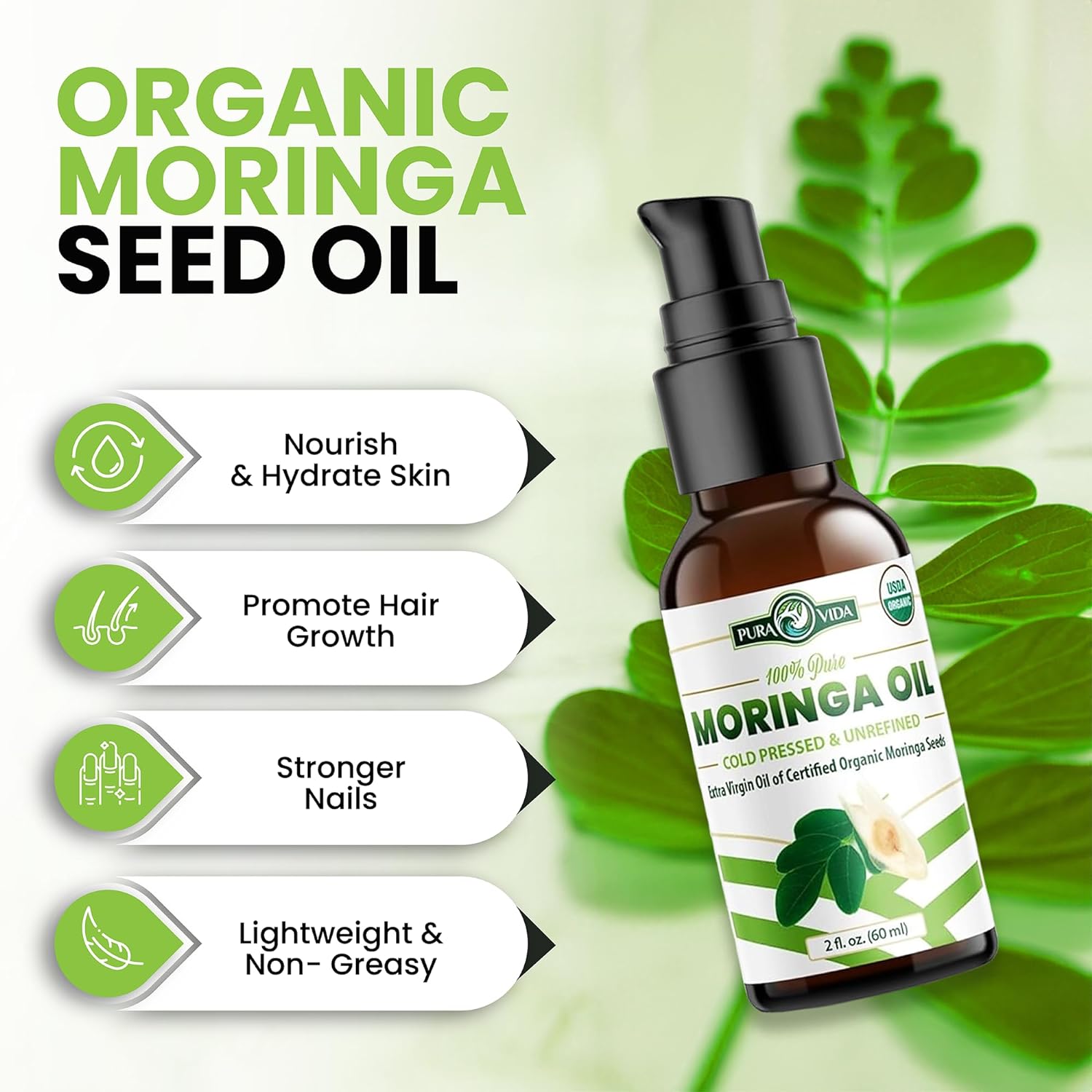 Single Origin Organic Moringa Oil: Experience 100% Purity and USDA Certified Organic Moringa Seed Oil, sourced exclusively from a single farm on the volcanic foothills in South America. Unmatched in quality, this Moringa oil stands out as the only single-origin Moringa oil available on AmazonNourishing Moringa Oil for Skin: Pamper your skin with the enriching benefits of Moringa oil organic. Ideal for facial application, this oil helps combat signs of aging, hydrates dry skin, and leaves your complexion looking radiant and healthyRevitalize Your Hair: Discover the transformative effects of our oil for hair. Rich in nutrients, this Moringa seed oil deeply nourishes, repairs damaged hair, and imparts a natural shine, making it an essential part of your hair care routineOrganic Moringa Seeds - The Essence of Purity: Extracted using cold-pressed, unrefined methods from the finest Moringa seeds, our Moringa oil maintains its natural potency, ensuring you receive all the benefits of its nutrient-rich profileFood Grade & 3rd Party Tested for Assurance: Not just for external use, our Moringa oil organic is food grade, allowing for versatile uses. Rigorously 3rd Party Tested, we ensure you get nothing but the best, pure Moringa oil with each bottle