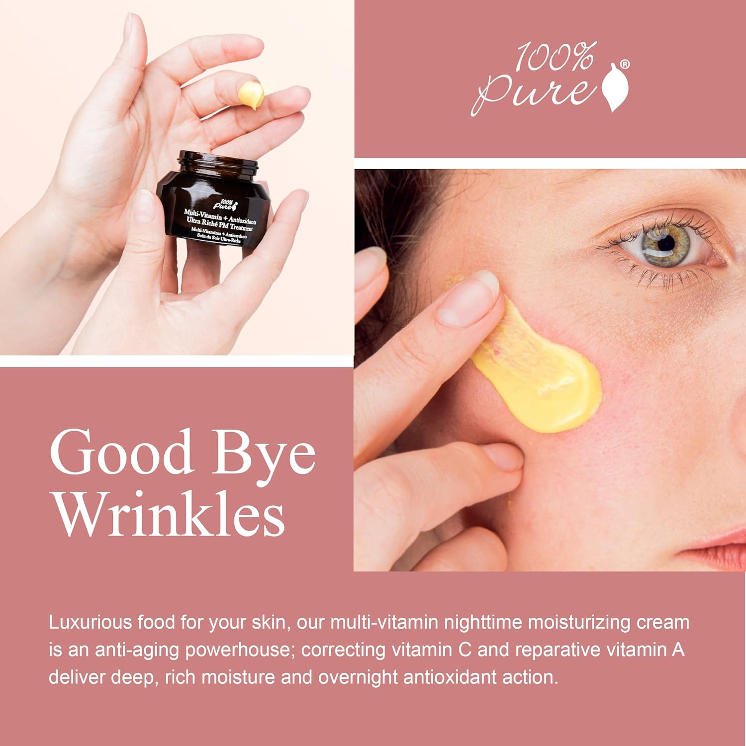 100% Pure Multi-Vitamin + Antioxidants Ultra Riche Pm Treatment Skin Renewing Night Cream Vitamin C & Retinol Facial Moisturizer, Powerful Anti-Aging Moisture Replenishment - 1.5 Oz