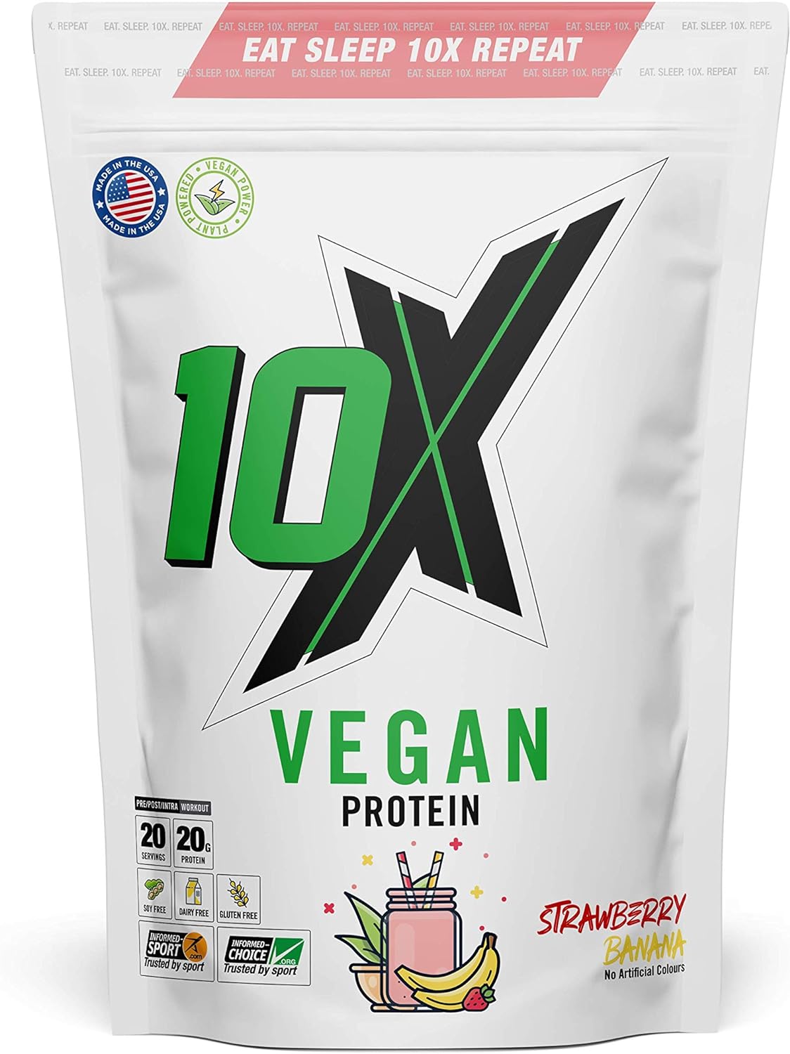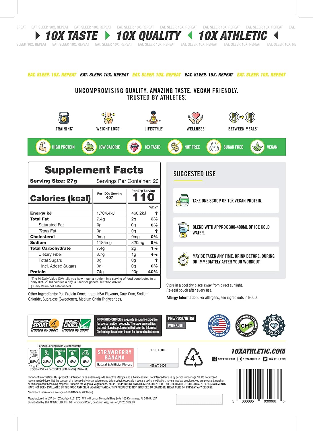 DESCRIPTION : 10X Athletic Vegan Protein, Nut Free, Sugar Free, Plant Based, Dairy Free, Gluten Free, Various Flavours , 580g (Strawberry Banana)