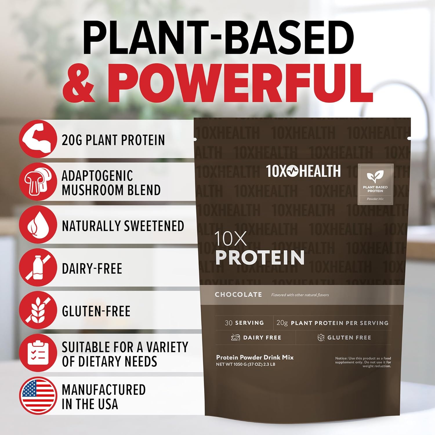 About this item Premium Plant Protein Power: Fuel your body with 20g of clean plant based protein per serving, ideal for supporting muscle growth, strength, and nutrition. This protein powder comes in a delicious Chocolate flavor you'll love. Fuel Your Body & Mind: This chocolate protein powder includes a potent adaptogenic mushroom blend with six functional mushrooms, including reishi and lionās mane, to support brain health, immunity, and overall vitality. Gluten-Free, Dairy-Free, 100% Plant-Based: This meal replacement powder is made for a variety of lifestyles and dietary needs. This is gluten-free, dairy-free, and entirely plant-powered for clean, inclusive nutrition. Lean and Clean Formula: Designed with your fitness in mind, this plant protein powder is low in sugars and fat, has no unnecessary additives, and is rich in high-quality amino acids for muscle protein synthesis and optimal nutrition. Quality and Safety Focused: The 10X Plant Protein Powder from 10X Health System combines protein powder for women and men with premium ingredients. Every batch is rigorously tested for purity and quality, ensuring your wellness goals are met. See more product details,Premium Plant Protein Power: Fuel your body with 20g of clean plant based protein per serving, ideal for supporting muscle growth, strength, and nutrition. This protein powder comes in a delicious Chocolate flavor you'll love,Fuel Your Body & Mind: This chocolate protein powder includes a potent adaptogenic mushroom blend with six functional mushrooms, including reishi and lionās mane, to support brain health, immunity, and overall vitality,Gluten-Free, Dairy-Free, 100% Plant-Based: This meal replacement powder is made for a variety of lifestyles and dietary needs. This is gluten-free, dairy-free, and entirely plant-powered for clean, inclusive nutrition,Lean and Clean Formula: Designed with your fitness in mind, this plant protein powder is low in sugars and fat, has no unnecessary additives, and is rich in high-quality amino acids for muscle protein synthesis and optimal nutrition,Quality and Safety Focused: The 10X Plant Protein Powder from 10X Health System combines protein powder for women and men with premium ingredients. Every batch is rigorously tested for purity and quality, ensuring your wellness goals are met