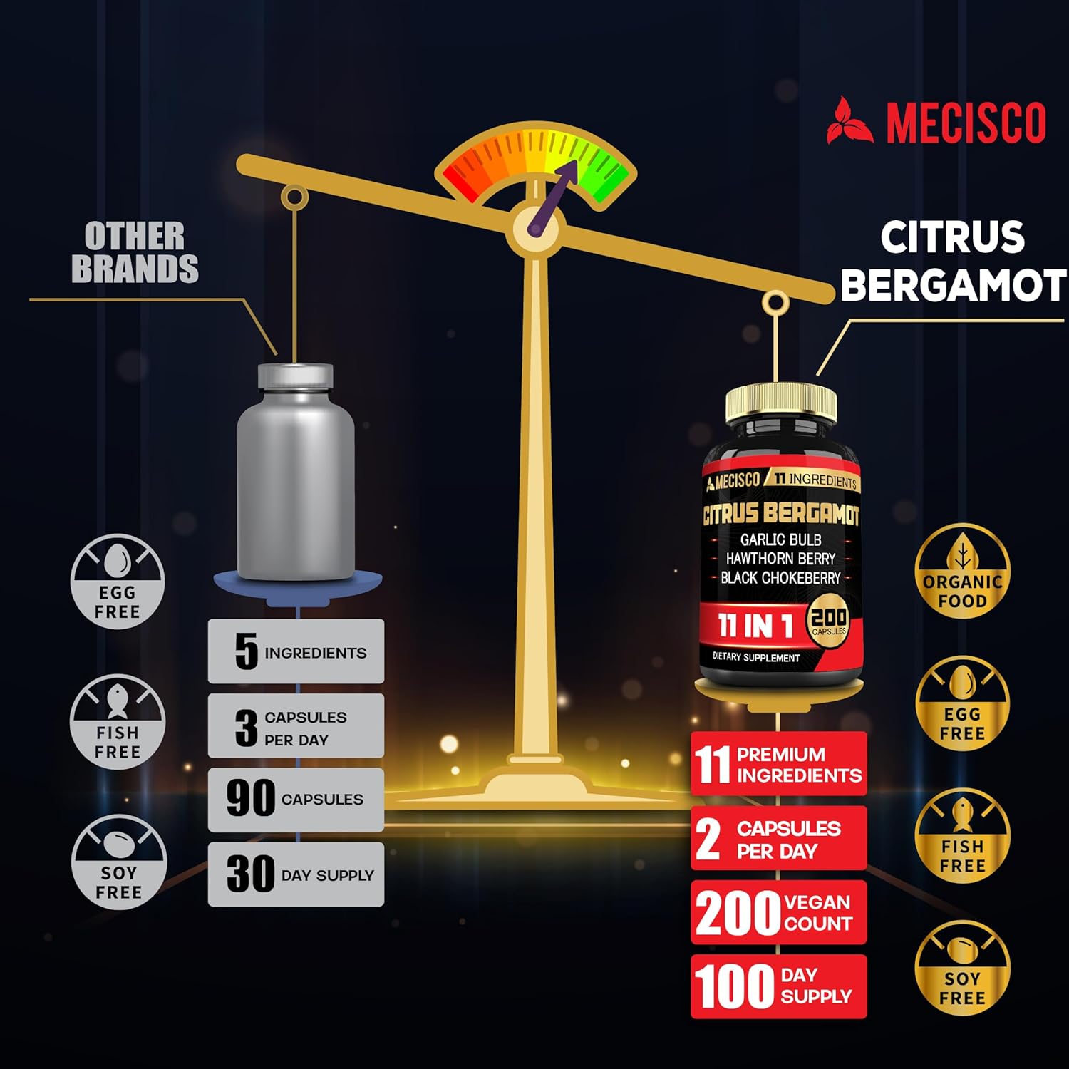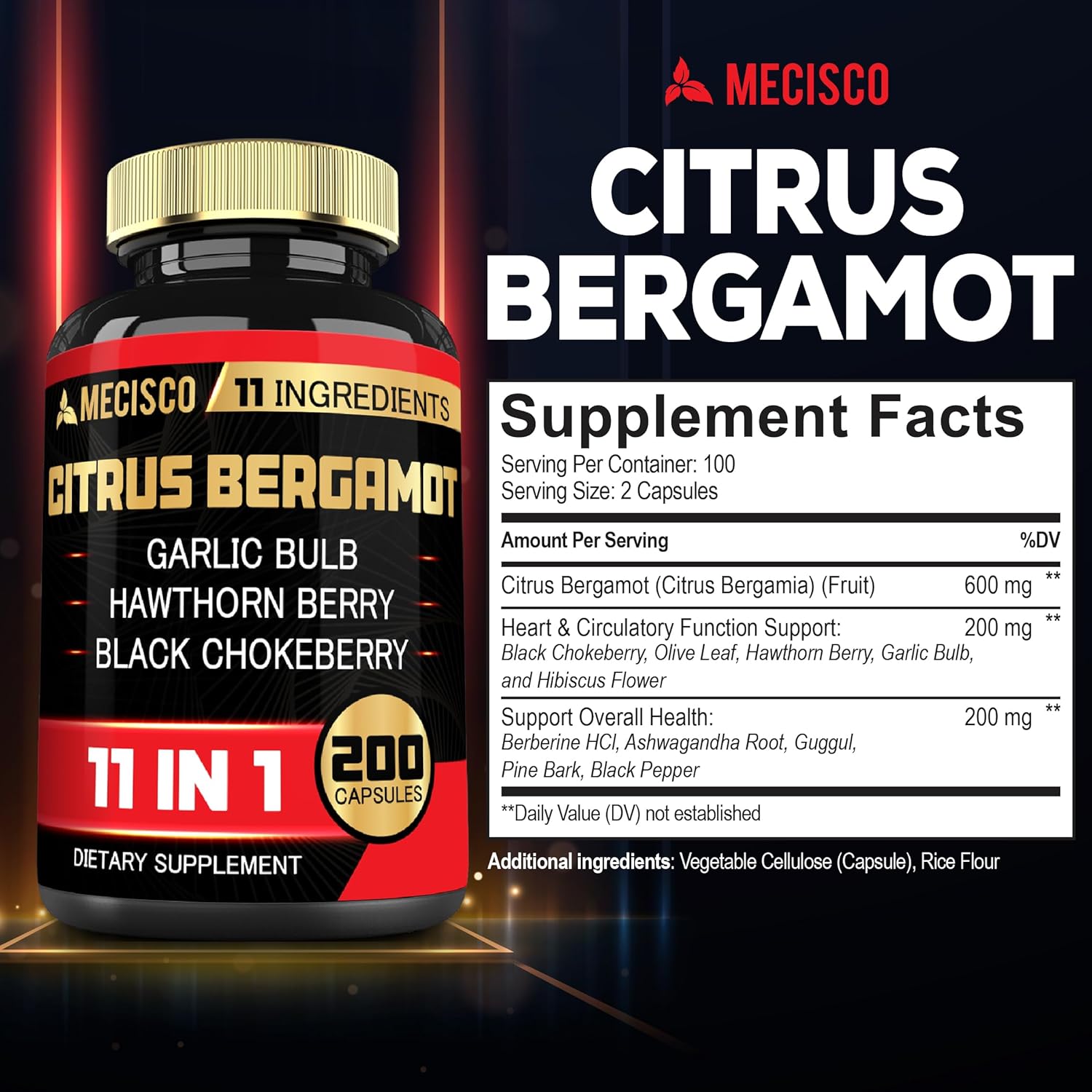 About this item Advance General Health: Citrus Bergamot, also known as Bergamot Orange, is gaining recognition for potential health benefits, particularly support for heart health, immune system & body management. Super Formula: In addition to the main ingredient, we also combine 10 ingredients including Black Chokeberry, Olive Leaf, Hawthorn Berry, Garlic and Hibiscus Flower, and herbal complex support for overall health such as Berberine, Ashwagandha, Guggul, Pine Bark, Black Pepper. Comprehensive support so your body can absorb new benefits for the new single day. Easy to Use: 1 package with 90 counts. Take 2 Citrus Bergamot Extract pills equivalent to 1000mg per serving for 45-day consumption. Suitable for vegetarians. An optimal solution to protect consumers' health with a modern lifestyle. Outstanding Value: All Natural Mecisco Bootle are sourced from a trusted & certificated facility manufacturer by strict processes to ensure international quality standards such as cGMP, ISO, FDA Registered facility & USA verified Laboratory. Satisfaction Guaranteed: Mecisco Supplement with a comprehensive refund policy. Our mission is to offer our customers beneficial supplements of high quality. If, for any reason, you are dissatisfied with your order, please don't hesitate to reach out to us to request a refund. Your satisfaction is our top priority. See more product details, Advance General Health: Citrus Bergamot, also known as Bergamot Orange, is gaining recognition for potential health benefits, particularly support for heart health, immune system & body management, Super Formula: In addition to the main ingredient, we also combine 10 ingredients including Black Chokeberry, Olive Leaf, Hawthorn Berry, Garlic and Hibiscus Flower, and herbal complex support for overall health such as Berberine, Ashwagandha, Guggul, Pine Bark, Black Pepper. Comprehensive support so your body can absorb new benefits for the new single day, Easy to Use: 1 package with 90 counts. Take 2 Citrus Bergamot Extract pills equivalent to 1000mg per serving for 45-day consumption. Suitable for vegetarians. An optimal solution to protect consumers' health with a modern lifestyle, Outstanding Value: All Natural Mecisco Bootle are sourced from a trusted & certificated facility manufacturer by strict processes to ensure international quality standards such as cGMP, ISO, FDA Registered facility & USA verified Laboratory, Satisfaction Guaranteed: Mecisco Supplement with a comprehensive refund policy. Our mission is to offer our customers beneficial supplements of high quality. If, for any reason, you are dissatisfied with your order, please don't hesitate to reach out to us to request a refund. Your satisfaction is our top priority