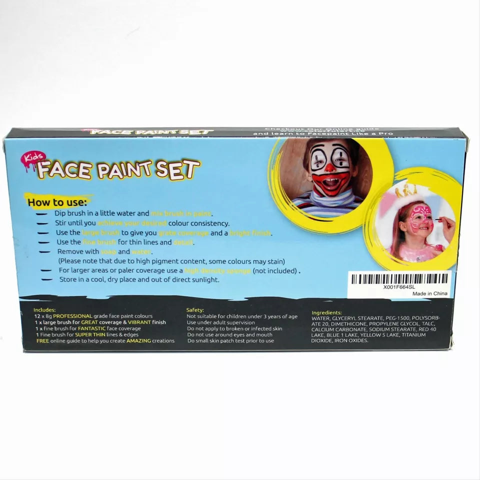 The 12 Color Face Paint Kit for Kids Washable Set is a fun and vibrant face painting kit designed for parties, festivals, and creative play. It features 12 bright and easily blendable colors, perfect for creating a wide range of designs on children's faces. The paints are water-based, non-toxic, and washable, ensuring they are safe for kids and easy to remove with soap and water. The kit includes stencils to help create fun and easy designs, making it perfect for beginners and experienced face painters alike. Ideal for birthday parties, Halloween, or any celebration, this face paint set brings creativity and excitement to any event.