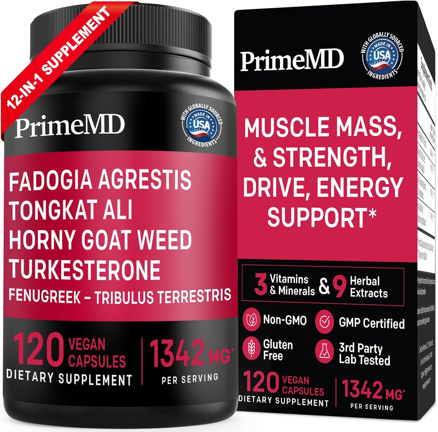 Who is this For? Our testosterone supplement with Tongkat Ali for men has vitamins, minerals, 9 herbal extracts for busting workout plateaus and optimizing physical performanceWhat Are The Ingredients? This daily supplement for men has Tongkat Ali and Fadogia Agrestis to support testosterone levels, energy, and for moving past downward slumps in your progressHow Does It Work? Our workout supplement promotes proper blood flow and circulation for going harder, lasting longer, and pushing past your limitsHow to Take - Take two capsules daily for optimal results. We enriched our muscle building supplements for men with Saw Palmetto, Fenugreek, Maca Root, Tribulus Terrestris, and Stinging NettleHow Long Does It Take To Work?- We meticulously prepared our Turkesterone supplement in a GMP-certified facility. It has no fillers, preservatives, soy, dairy, or gluten. Expect results as early as 30 daysBust your workout plateaus, perform at your peak, and experience physical performance like no other. Introducing PrimeMD 12-in-1 Fadogia Agrestis & Tongkat Ali Mens Testosterone Support and Male Health Support. This powerful muscle builder for men supplement works to provide your body with the energy you need to finish strong every set, every rep, and every gym day. Unlike other natural testosterone support for men, testerone supplement, tonga ali, and tongkat ali fadogia agrestis, ours contain a synergy of 3 vitamins and minerals, and 9 herbal extracts that work together to support consistent energy, and the kind of stamina that lets you keep going, whether you're in the gym or somewhere else.. Feel and think like a champ with the help of Tongkat Ali and Turkesterone, which are both known to promote balanced cortisol levels for regulating stress responses. With a blend like ours, you'll build muscle faster and fight off post-workout burnout to go even harder the next day. Turkesterone, Tribulus Terrestris, and Maca root also support overall physical performance, body composition, and muscle aesthetics. Why take multiple supplements for energy and testosterone levels if you can get everything you need for hormone balance and male health in one serving? Try PrimeMD's 12-in-1 Fadogia Agrestis & Tongkat Ali Muscle Testosterone Support Supplement Today!