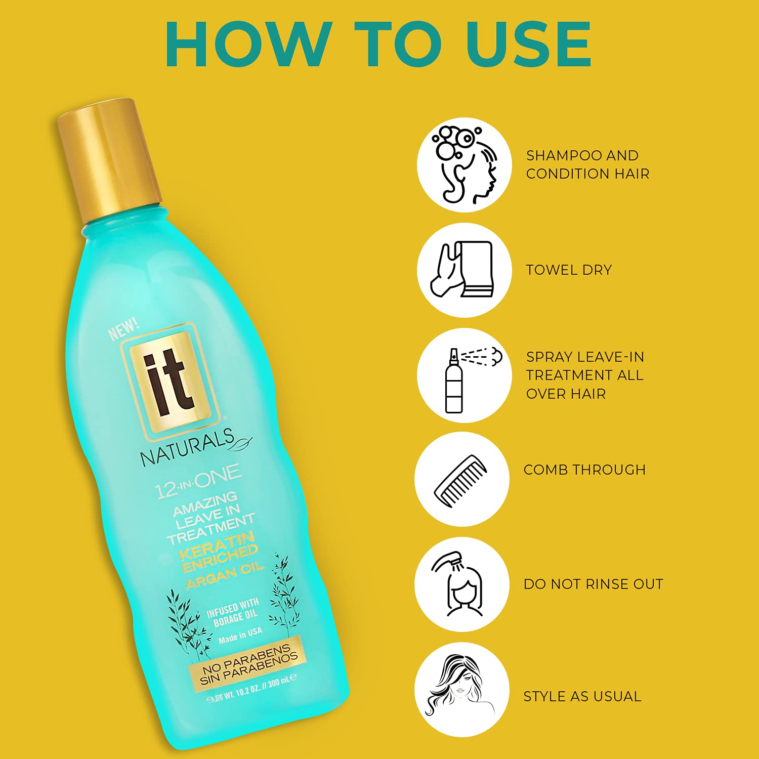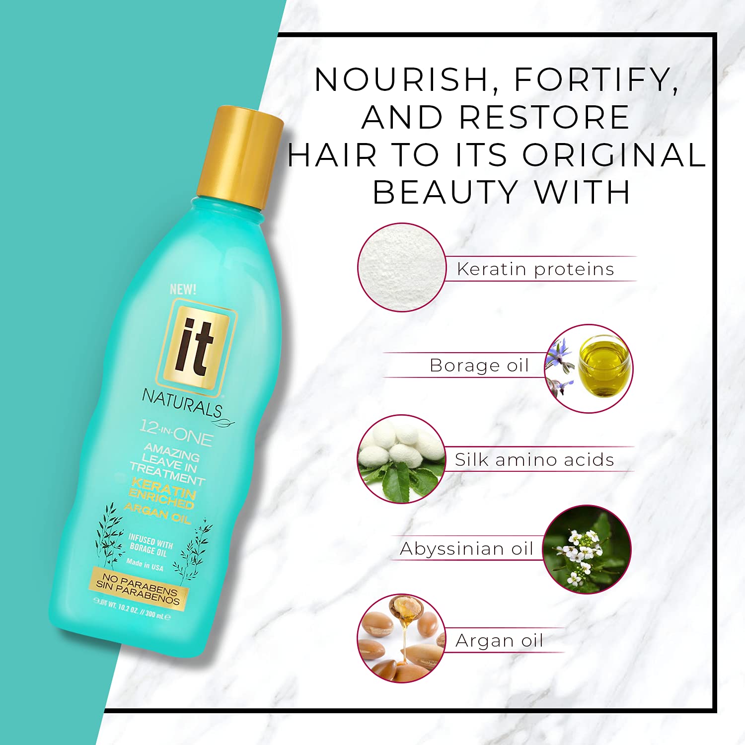 IT Naturals12-in-ONE Keratin-Enriched Leave-In Treatment: This luxury leave-in treatment delivers gorgeous, touchable, silky soft hair, while addressing most common hair concerns in one 10.2-oz bottle. Enriched with keratin proteins and argan oil for smooth cuticles and frizz control and infused with moisturizing borage oil, silk amino acids, and Abyssinian oil. Repairs breakage and split ends, detangles, restores body, and more