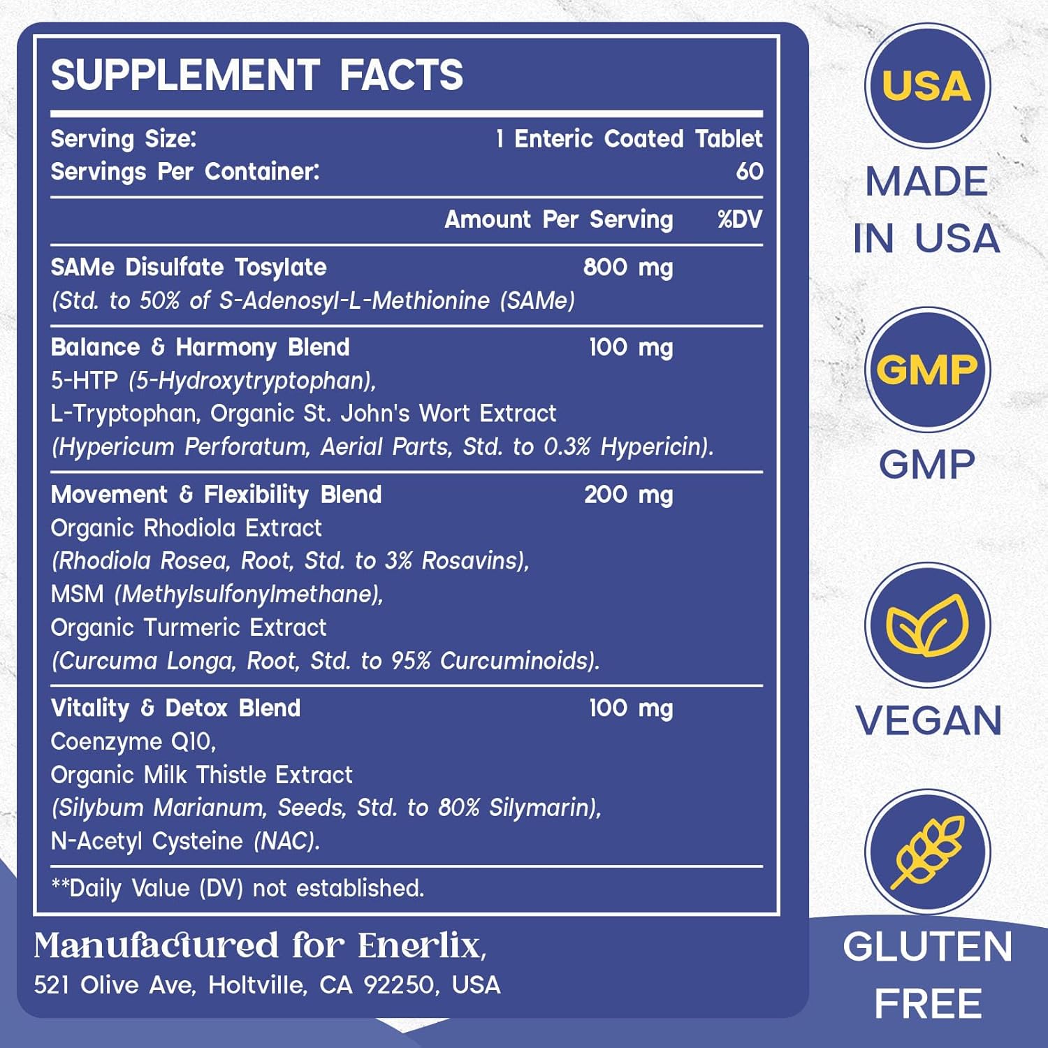 High Quality & Potency: Enerlix's sam-e supplement is vegan, gluten-free, and free of artificial flavors and preservatives, ensuring purity and potency. Produced in the USA in a GMP-compliant facility to meet the high standards for efficacy