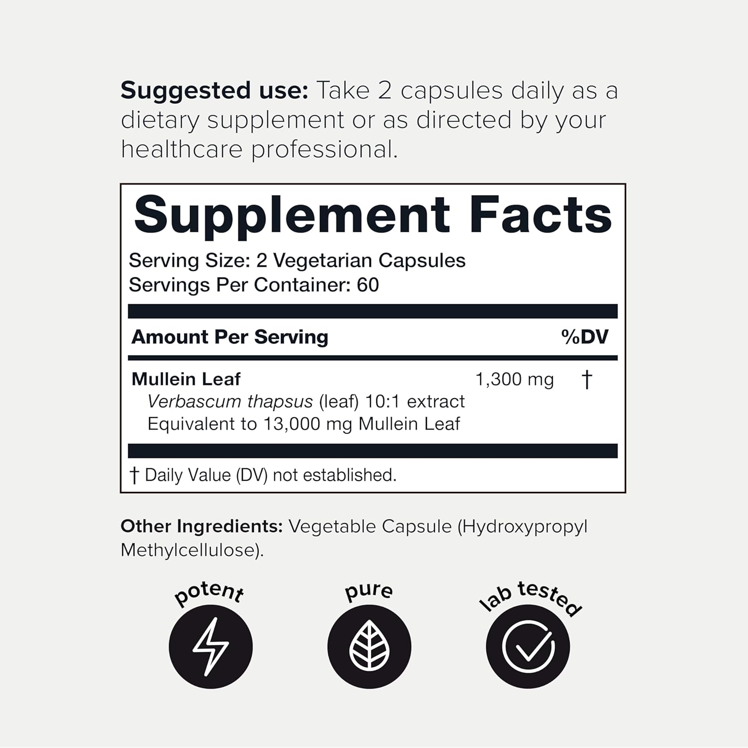 DESCRIPTION : 13,000mg Mullein Leaf Capsules - 10:1 Ultra Concentrated Mullein - Third-Party Tested Mullein Leaf Herb - 120 Vegetable Capsules - Gluten Free Supplement - 1300mg Extract Per Serving - Lab Tested TQ