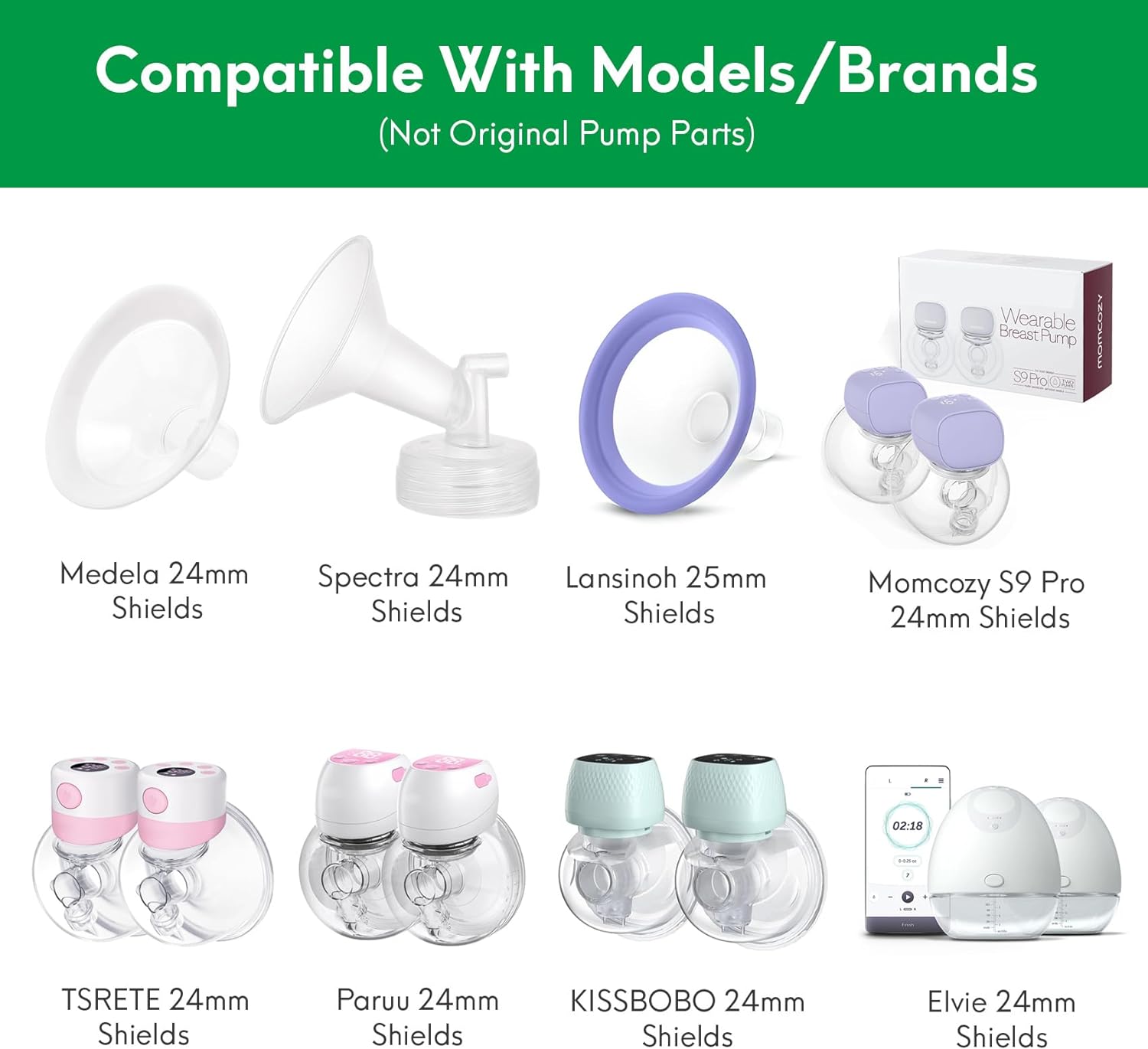 CompatibilityLOZAEVE 13/15/17/18/19/20/21mm flange inserts are breast pump accessories. Suitable for almost any 24-25mm wearable breast pump shields and Hands-Free breast pump Shields. Compatible with Momcozy S9/S9 Pro, S10, S12/S12 Pro, Medela, Spectra, Elvie, Elvie Stride, S18 S21 S23, Bellababy, Motif Luna, Ameda MYA, TSRETE, kmaier, Lansinoh, Ainsir, Phanpy, Lulia, NaNaLazy, Luxlady, kidzio, Teexin, Fisroa, KISSBOBO, Goldeep, BIOBOO, Mumeasy,Nanawawa, TOVVILD etc10Multiple Size Options10 size provide, 13/14/15/16/17/18/19/20/21/22. Different lactation periods provide more cozy experience, selection of the right flange size can help the breast milk to drain smoothly. Attention these breast pump accessories are only suitable for 24-25mm Shields/Flanges and cannot be used with other sizes of shields/flanges10Safety MaterialMade of transparent food grade silicone material. Product is BPA-free, easy to clean, you can use it with confidence. Before use Can be sanitized with water steam, boiling water or microwave-steam bags. Using coconut oil or nipple butter can reduce friction and make them easier to use10SaveThese replacement pump parts will save you the hassle of testing nipple size and selection. Many moms have nipples of varying sizes that can also change in size at different times, so it's important to monitor the appearance of the nipple during pumping. If your nipple size is less than 24mm, we have a suitable set for you10Easy CleaningAfter each use, wash the replacement pump parts with warm soapy water and rinse them thoroughly. It is recommended to replace the flange insert every 1 to 2 months. Please ensure you choose the correct size