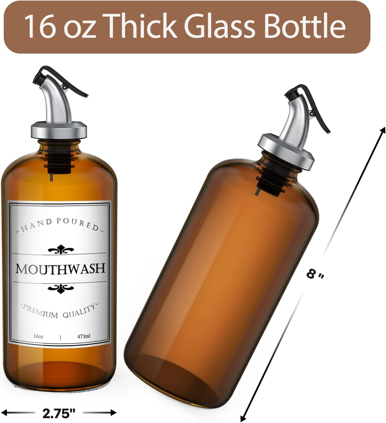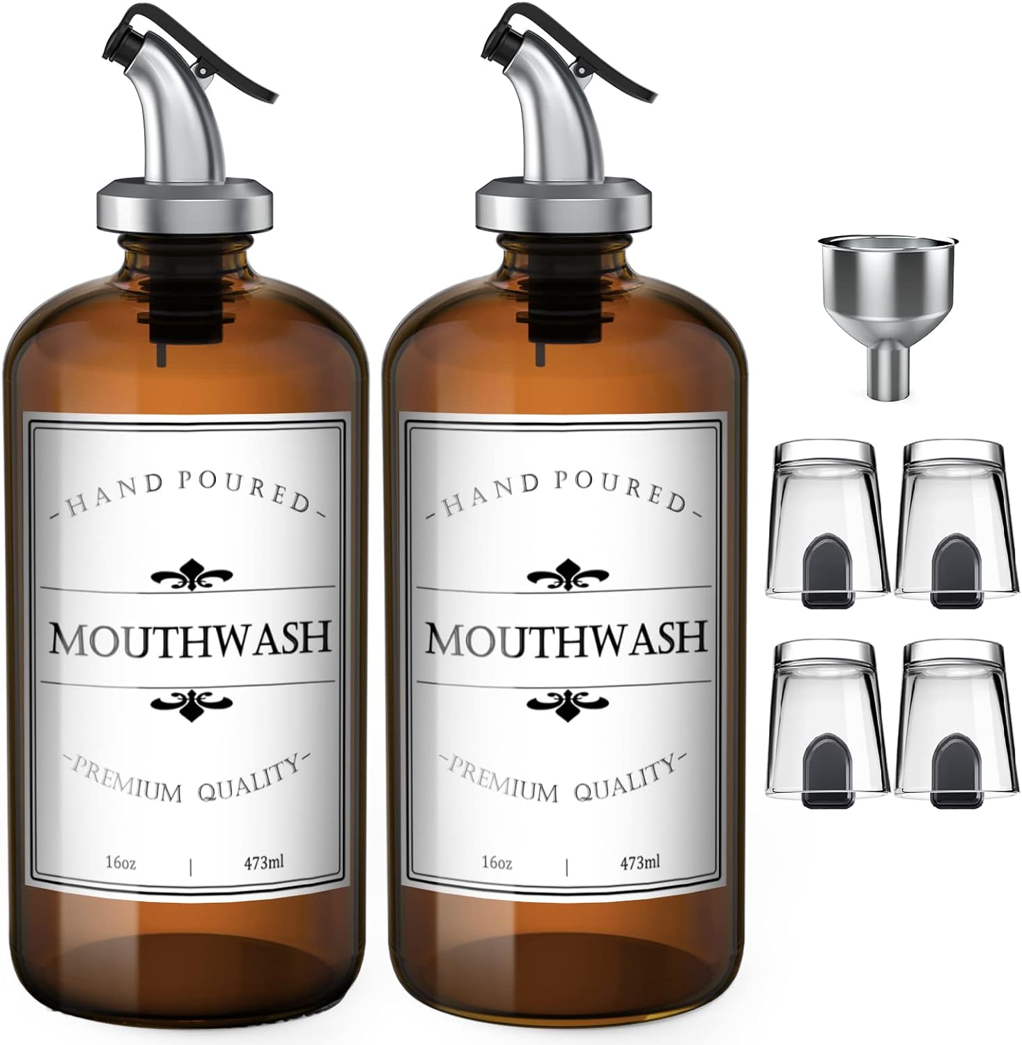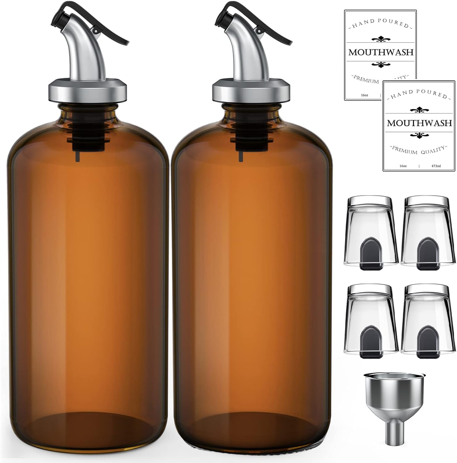 ABOUT THE PRODUCT: 1 > Mouthwash Dispenser Set 16oz empty glass bottle * 2, pour spout *2, shot glass * 4, stainless steel funnel * 1, Labels * 2. 16oz size is large enough to store liquids. The funnel can help to refill the liquid. 2 labels help identify liquids in the bottle 2 > Durable Thick Mouthwash Glass BottleMouthwash Bottle is made of lead-free glass that protects the safety of your mouthwash Amber glass with ultraviolet protection is excellent for preserving the effect of mouthwash.16 Oz Boston Round bottle is dishwasher safe and reusable 3 > Accurate Control and No Leaking SpoutsSpouts are made of BPA FREE materials. This is a nice bathroom accessory. Compared with other mouthwash dispenser pumps, this upgraded mouthwash dispenser set offers a pour spout for easier control and more accurate pour into the shot glass cup. The spouts have rubber closures contacting the bottle mouth keeping it tightly sealed and no drip16oz Amber Glass Mouthwash Dispenser for Bathroom, 2 Pack Thick Mouthwash Bottles Container with 2 Pour Spouts, 4 Reusable Mouthwash Cups, 2 Waterproof Labels and Funnel