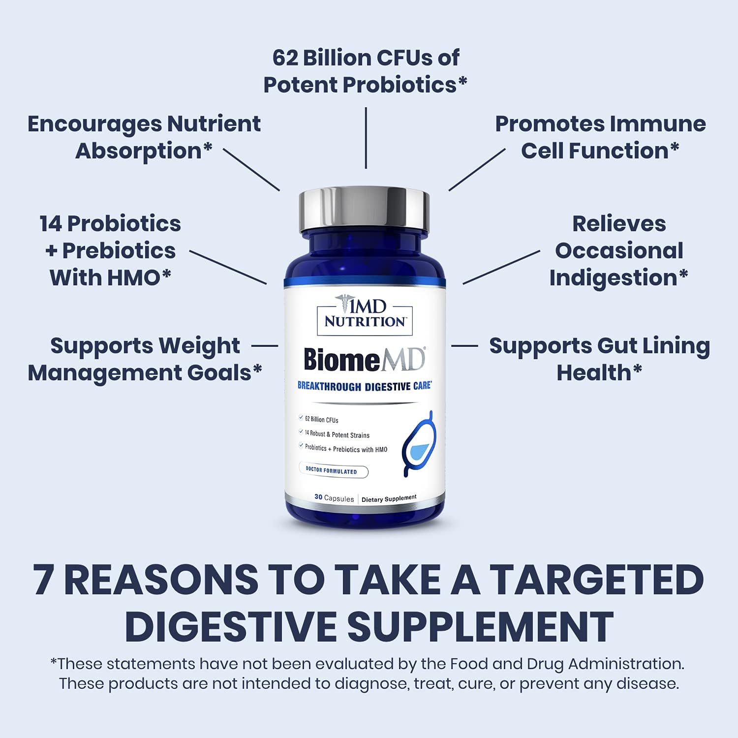 3 >Microbiome Balance: BiomeMD restores the right probiotic bacteria to your gut’s microbiome while nourishing them with powerful prebiotics they need to thrive.* This helps restore and maintain a strong balance of “good” bacteria in the gut for digestive and immune health