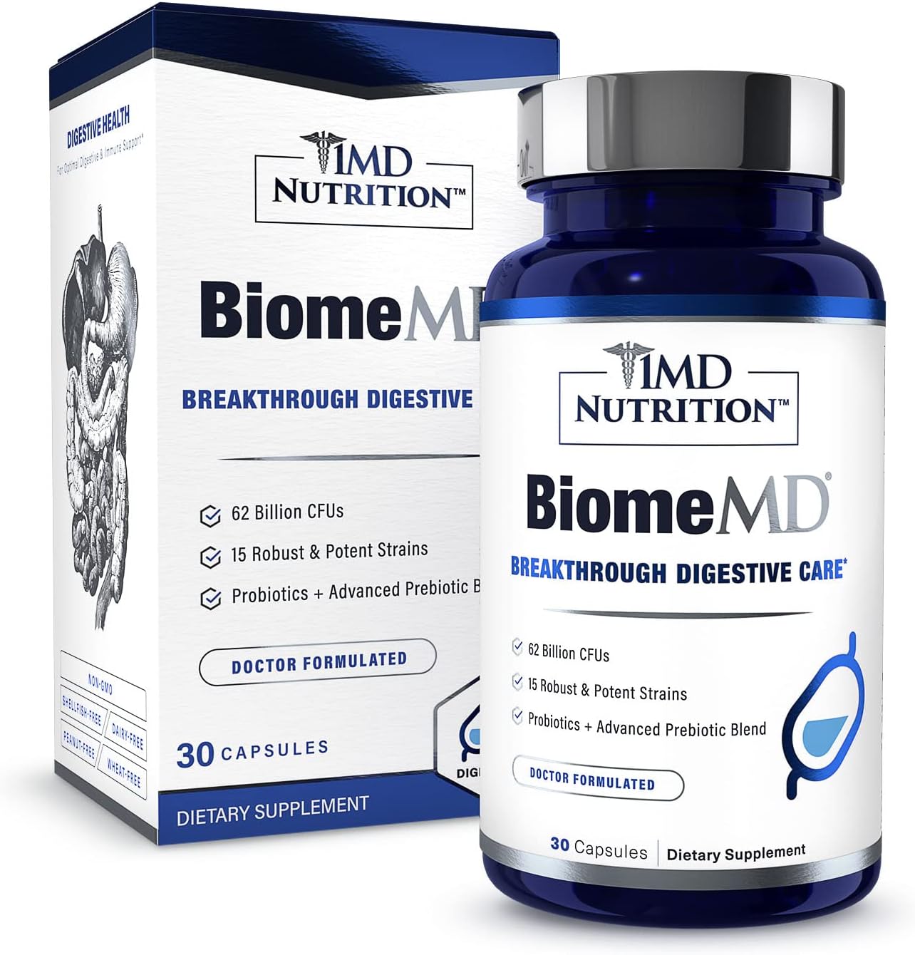 DESCRIPTION : 1MD Nutrition BiomeMD Probiotics | 62 Billion CFUs, 15 Comprehensive Strains - Pro & Prebiotics | Doctor-Formulated for Digestive Health & Immune Support | 30 Capsules