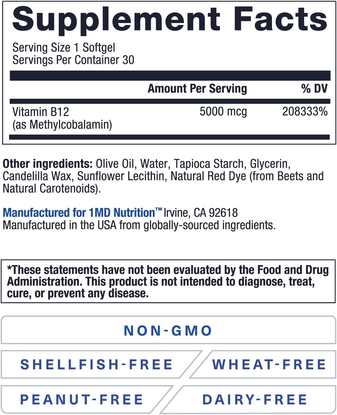 1Md Nutrition Vegan Vitamin B12 Softgels | 5000Mcg Methylcobalamin Supplement | Energy, Immune, And Cardiovascular Support | 60 Softgels