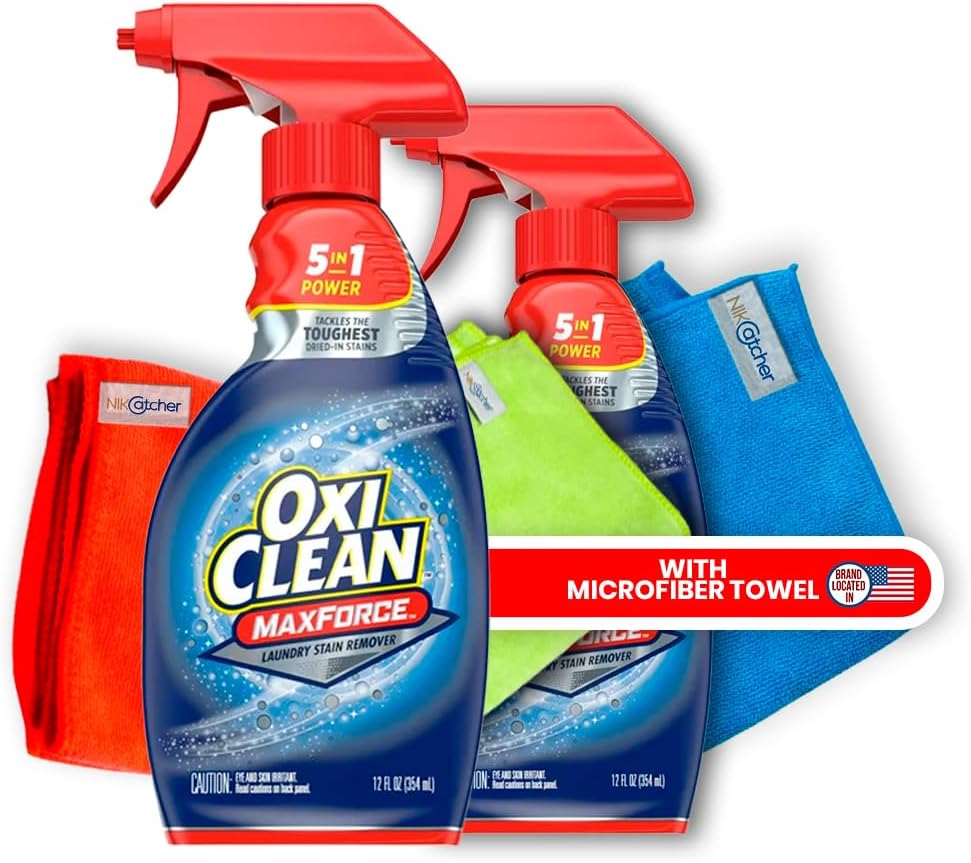 Powerful Stain Removal: Oxiclean Max Force Laundry Stain Remover Spray effectively eliminates even the toughest stains, such as coffee, ink, grass, and grease, restoring garments to their original condition10Versatile Use: The stain remover spray can be used on a wide range of fabrics, making it suitable for both clothing and household items, ensuring a stain-free environment10Efficient Cleaning: The 16x16-inch 400 GSM Microfiber Cleaning Cloth Towels offer exceptional cleaning performance, effortlessly lifting dust, dirt, and grime from surfaces10Multi-Purpose: Microfiber Cleaning Cloths are perfect for various cleaning tasks, from wiping down kitchen countertops to polishing glass and mirrors, providing a convenient all-in-one cleaning solution10Value Bundle: The bundle offers the combined benefits of Oxiclean Max Force and Microfiber Cleaning Cloths, providing excellent value for money with a potent stain-fighting and cleaning combination