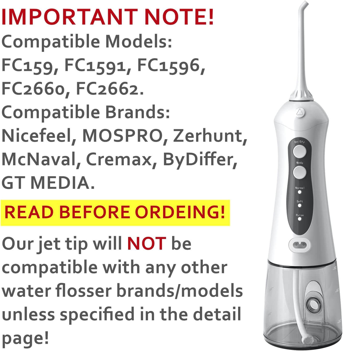 Package Included : 2 Pack Standard High Pressure Jet Tips IMPORTANT NOTE: Our jet tip will NOT be compatible with any other water flosser brands/models unless specified in the detail page!