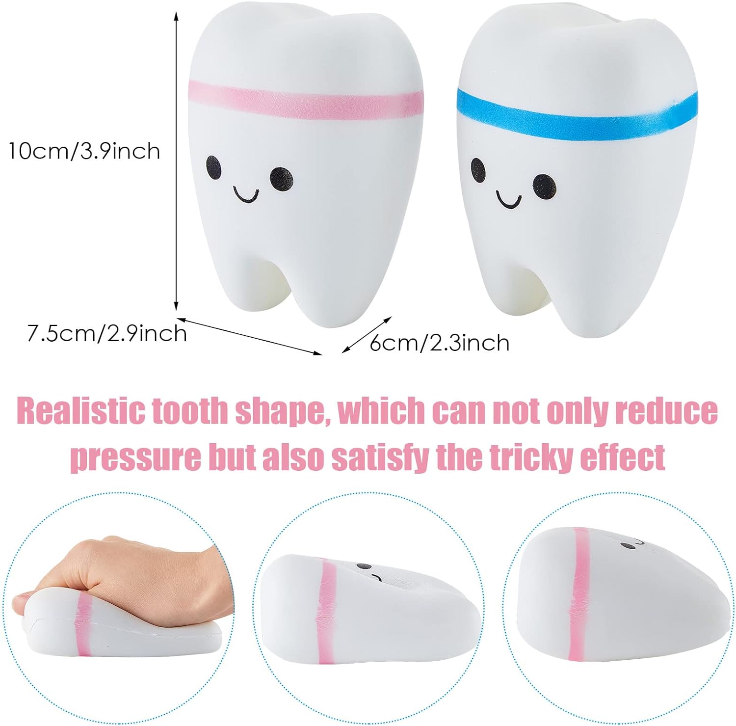 ABOUT THE PRODUCT: 1 > Adequate to Meet Your Needs: you will receive 2 pieces of dental student gifts in different colors; The quantity and colors are sufficient for you to use and replace, and can easily meet your daily use and other requirements 2 > Proper Dimension to Apply: the size of the squish tooth is about 10 x 7.5 x 6 cm/ 3.94 x 2.95 x 2.36 inches, appropriate and compact for you to use and play, without taking up too much space 3 > Serviceable and Lasting: each tooth stress toy is made of quality foam, reliable and sustained, not easy to deform or break, and can be kept for a long time; The surface of the toy is smooth and comfortable to touch, so you do not need to worry about scratching your fingersFeatures: Portable and lightweight: These funny gifts for dentists are portable and light in weight, so they can be carried easily. You can put them in your handbag, backpack, makeup bag, luggage and more, which are suitable for you to carry to travel, have business trips, and do other activities. Easy to clean: Our dental toy is washable, you can clean it after using easily and quickly, just with clean water and soap. It's efficient for you to use, saving time and effort and bringing more convenience. Specifications: Material: foam Main color: white and pink, white and blue Size: approx. 10 x 7.5 x 6 cm/ 3.94 x 2.95 x 2.36 inches Package includes: 2 x Squishy tooth Notes: Manual measurement, please allow slight errors on size. The color may exist a slight difference due to different screen displays. Our products are suitable for people above 6 years