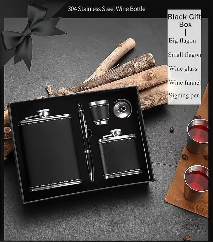 Enjoy your favorite drinks on the go with this Premium Stainless Steel Hip Flask Set. The set includes 2 sleek, leak-proof pocket flasks, a convenient funnel for easy refilling, and a durable wine glass for a touch of elegance wherever you are.