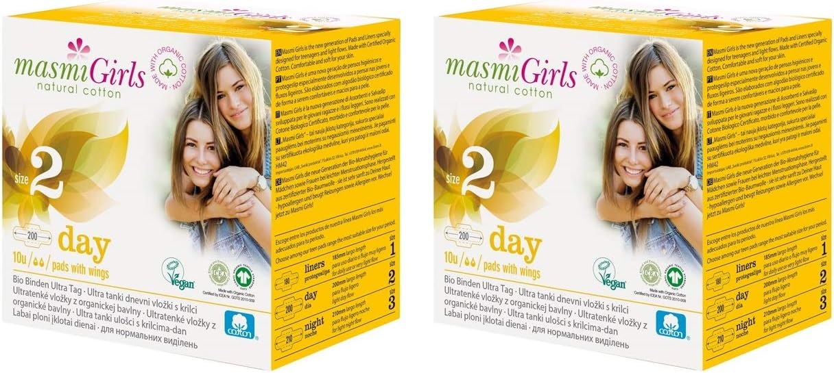 2 X 10 Organic Teen First Period Day Pads With Wings. Organic, Vegan, Biodegradable, Individually Wrapped. Masmi