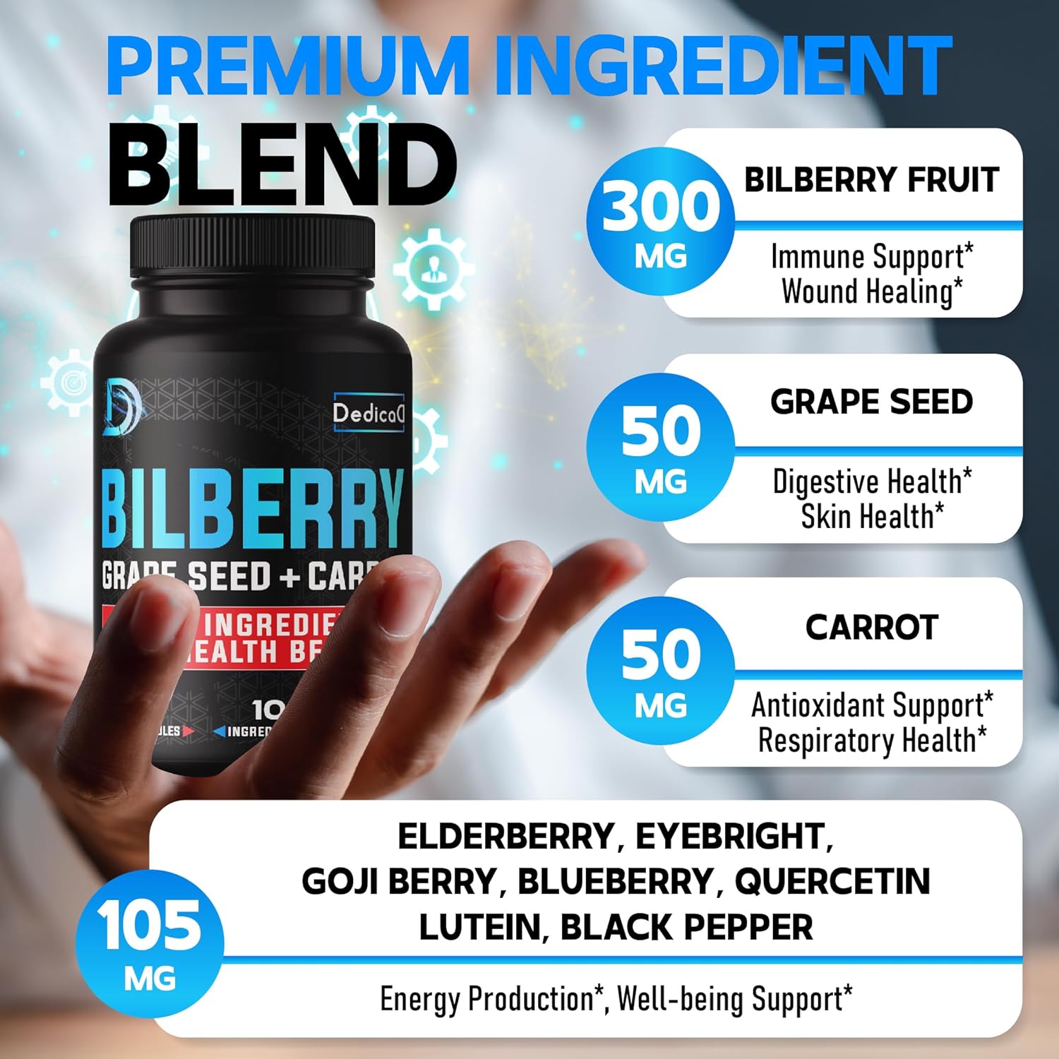 About this item ?? Premium Bilberry Supplement offer various health benefits, Bilberry extract blend supporting healthy eyes, vision, a strong heart and immune system for overall well-being. ?? Blend of 10 including Bilberry Powder, Grape Seed, Carrot, Elderberry, Eyebright, Goji Berry, BlueBerry, Quercetin, Lutein, and Black Pepper. Obtaining natural herbal ingredients from organic farms assures the finest quality. ?? 1 Pack with 150 Counts for 5 Months - Consume 1 Billberry Capsule daily, a gluten-free, non-GMO, veggie capsule. We have exclusive combinations that you won't find somewhere else. ?? Our Bilberry supplements are made from potent, natural herbs in a Halah & cGMP facility with organic ingredients with extraction technology. Vegetarian-friendly and globally third-party tested. ?? Trust DedicaD Bilberry Extract For Eyes Supplement for wellness and fulfilling life. Combine our supplement with exercise for optimal health. We prioritize customers and quality products. › See more product details,?? Premium Bilberry Supplement offer various health benefits, Bilberry extract blend supporting healthy eyes, vision, a strong heart and immune system for overall well-being,?? Blend of 10 including Bilberry Powder, Grape Seed, Carrot, Elderberry, Eyebright, Goji Berry, BlueBerry, Quercetin, Lutein, and Black Pepper. Obtaining natural herbal ingredients from organic farms assures the finest quality,?? 1 Pack with 150 Counts for 5 Months - Consume 1 Billberry Capsule daily, a gluten-free, non-GMO, veggie capsule. We have exclusive combinations that you won't find somewhere else,?? Our Bilberry supplements are made from potent, natural herbs in a Halah & cGMP facility with organic ingredients with extraction technology. Vegetarian-friendly and globally third-party tested,?? Trust DedicaD Bilberry Extract For Eyes Supplement for wellness and fulfilling life. Combine our supplement with exercise for optimal health. We prioritize customers and quality products