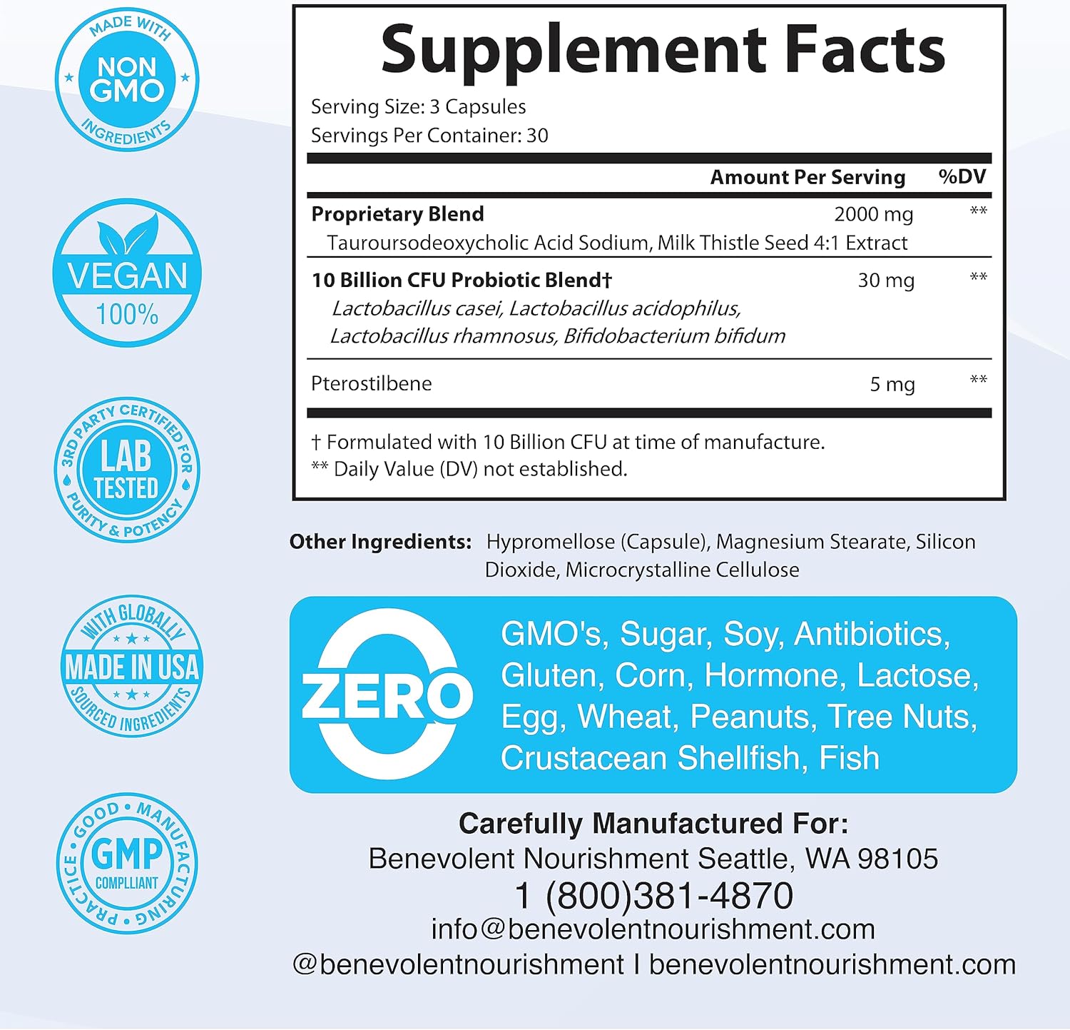 About this item Advanced liver support formula - You may be surprised at the benefits that Tudca can offer! Tudca (tauroursodeoxycholic acid), also known as bile salts, is the most comprehensive formula that supports the gallbladder, improves digestion, promotes kidney health, reduces inflammation, and restores the integrity of liver cells. Tudca is a traditional, trusted ingredient used for decades to boost liver wellness. Unique and powerful formulation - Benevolent Nourishment's Tudca supplement contains 2000mg of tudca blended with milk thistle and 4 strains of premium probiotics with 10 billion CFUs. These potent ingredients are more than enough to support liver detoxification, boost bile production, balance liver enzymes, promote thyroid health, support the immune system and cognitive function, and help balance your body's natural systems naturally in just one capsule! No more settling for less - Forget about those bland capsules that provide little to no benefit! With the power of nature and double strength, this serving provides 90 highly concentrated capsules to deliver 2,000mg maximum-strength TUDCA dose. When you take capsules of TUDCA daily, you will receive these essential active ingredients in their purest form, provided they have been absorbed by your body. The results A worry-free liver and a joyful life! Real deal: It's no secret that - TUDCA is a powerful compound that has been around for decades. We believe that nature is where it's at and made our TUDCA supplement to create the most bioavailable version of this trusted ingredient on the market today. Made in the USA - We proudly own & make our products in the USA with the highest GMP standards. Each and every batch is tested with 3rd party laboratories to ensure the highest purity, potency, and premium quality. › See more product details,Advanced liver support formula - You may be surprised at the benefits that Tudca can offer! Tudca (tauroursodeoxycholic acid), also known as bile salts, is the most comprehensive formula that supports the gallbladder, improves digestion, promotes kidney health, reduces inflammation, and restores the integrity of liver cells. Tudca is a traditional, trusted ingredient used for decades to boost liver wellness,Unique and powerful formulation - Benevolent Nourishment's Tudca supplement contains 2000mg of tudca blended with milk thistle and 4 strains of premium probiotics with 10 billion CFUs. These potent ingredients are more than enough to support liver detoxification, boost bile production, balance liver enzymes, promote thyroid health, support the immune system and cognitive function, and help balance your body's natural systems naturally in just one capsule!,No more settling for less - Forget about those bland capsules that provide little to no benefit! With the power of nature and double strength, this serving provides 90 highly concentrated capsules to deliver 2,000mg maximum-strength TUDCA dose. When you take capsules of TUDCA daily, you will receive these essential active ingredients in their purest form, provided they have been absorbed by your body. The results A worry-free liver and a joyful life!,Real deal: It's no secret that - TUDCA is a powerful compound that has been around for decades. We believe that nature is where it's at and made our TUDCA supplement to create the most bioavailable version of this trusted ingredient on the market today,Made in the USA - We proudly own & make our products in the USA with the highest GMP standards. Each and every batch is tested with 3rd party laboratories to ensure the highest purity, potency, and premium quality