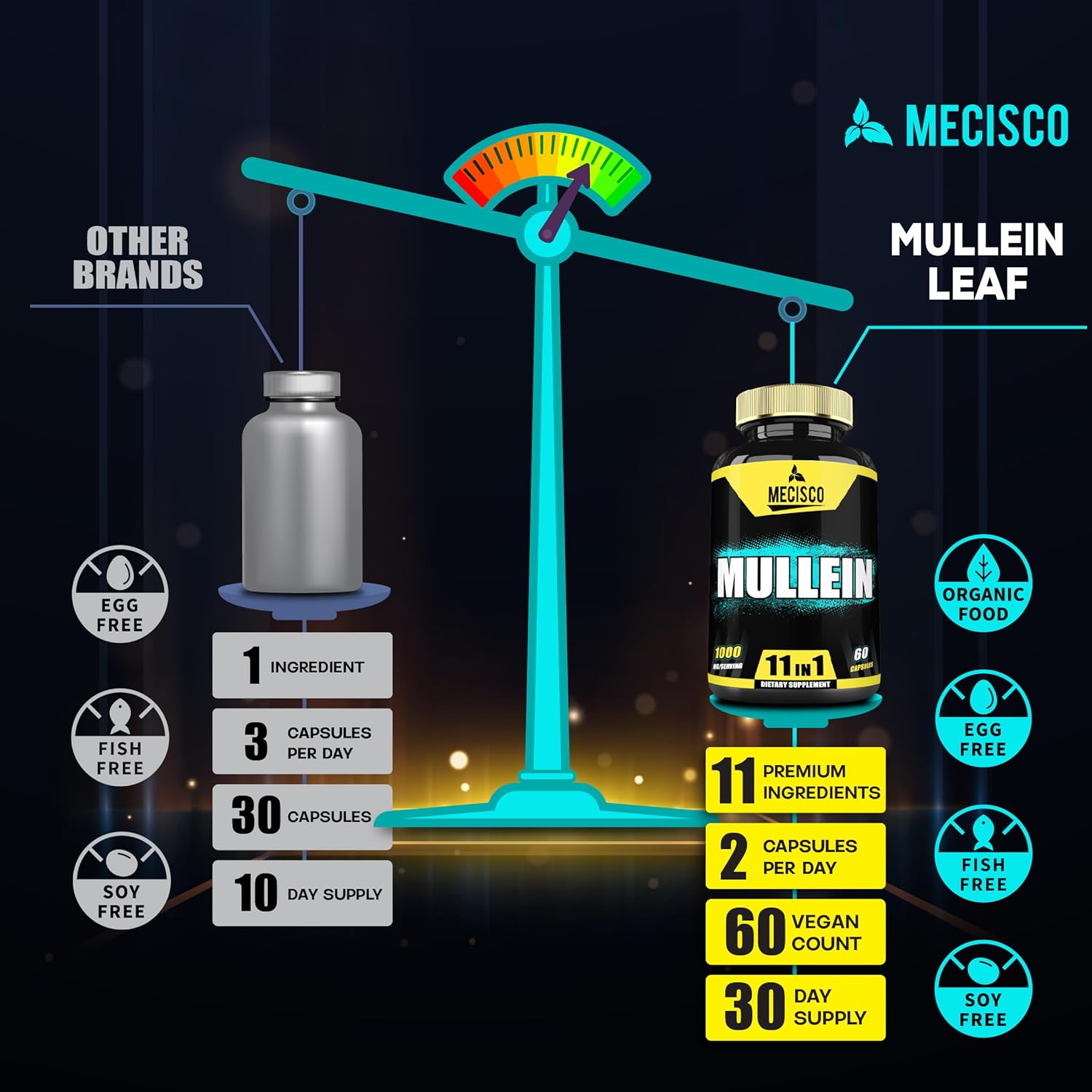 WHY SHOULD YOU CHOOSE SUPPLEMENTS FROM MECISCO Imagine having better concentration, more energy, stronger focus, sharper mind, and enhanced immune system - All from a super supplement. Dietary Supplements are laboratory tested on a regular basis for stability, purity, potency, and reliability. The most convenient solution by combining modern research with traditional methods with advanced biotechnology. Products are blended from essential herbs to provide good absorption and high health benefits for consumers. Products are highly concentrated for increased bioavailability, keeping you happy and healthy daily with a busy life. Bottles are premium quality for capsule protection, and safe for recycling. Mecisco products come in various forms, including liquid, capsules, gummies, and powder guaranteeing high-value natural health products for you and your family. Live the life you want, love the life you live! Don't miss out Mecisco supplements to safeguard your daily health, Optimize General Health: Mullein leaf, scientifically known as Verbascum thapsus, is a plant that is often used for various herbal purposes. The leaves of the mullein plant are soft and fuzzy and have a long history of traditional use in different cultures. It could support respiratory health, body balance, immune system & overall well-being, Superior Formula: We also combine an additional 11 ingredients Mullein Leaf Extract, support blend as Cordyceps Sinensis, Bromelain, Marshmallow, Olive and Pine Bark, and energy complex extract such as Panax Ginseng Root, Ginkgo Biloba Leaf, Organic Ashwagandha Root, Maca Root, and Saw Palmetto. Comprehensive support so your body can absorb new benefits for the new single day, Simple to Use: 1 package with 210 counts. Take 2 Mullein capsules equivalent to 1000mg per serving for 105-day consumption. Suitable for vegetarians. An optimal solution to protect consumers' health with a modern lifestyle, Outstanding Value: All Natural Mecisco Mullein Leaf Supplement is sourced from a trusted & certificated facility manufacturer by strict processes to ensure international quality standards such as cGMP, ISO, FDA Registered facility & USA verified Laboratory, Satisfaction Guaranteed: Mecisco bottles with a comprehensive refund policy. Our mission is to offer our customers beneficial supplements of high quality. If, for any reason, you are dissatisfied with your order, please don't hesitate to reach out to us to request a refund. Your satisfaction is our top priority