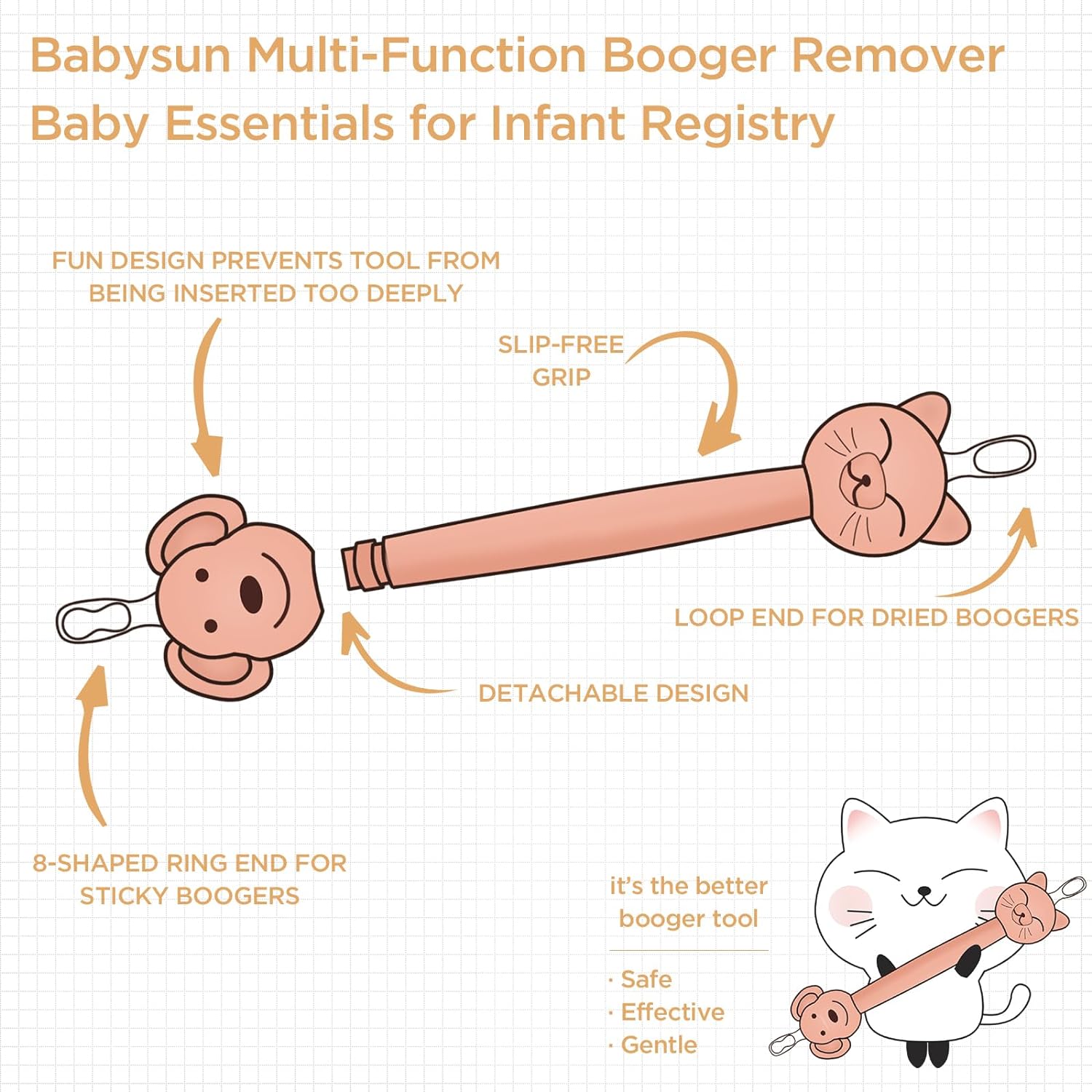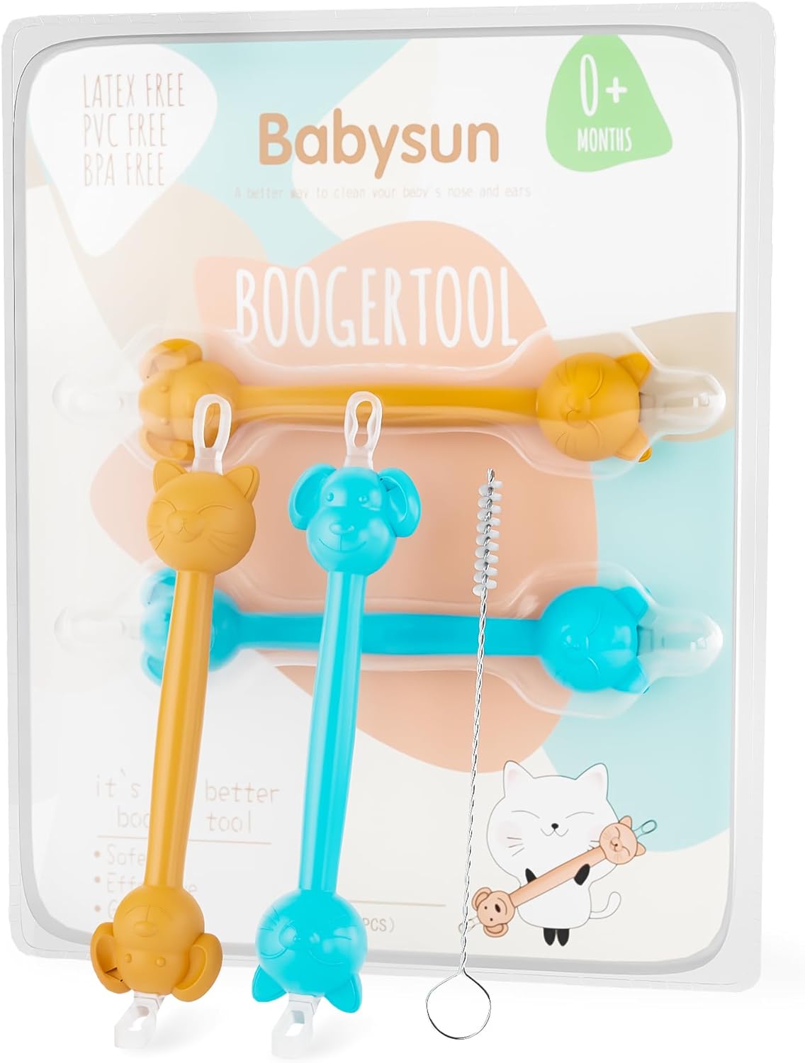 3 in 1 Snot Booger and Ear Wax Remover for BabyThe baby nose cleaner is among parents' top baby essentials for infant registry. the loop end can remove dried boogers from a newborn's nose and 8-shaped ring end lassos sticky boogers, It can also clean baby's earwax very easily. The beautiful packaging makes it the perfect gift for a baby shower!10Safe and Comfortable MaterialThe baby nose picker is made of soft food-grade materials(Soft silicone ends and high quality rubber body) without any constituent of BPA, which ensures the safety of newborn babies effectively. The baby nose picker enables moms to fiinish cleaning without bothering babies and thus helps babies enjoy more relaxed breathe and sleep10Never Suck AgainAs we all know, nasal aspirator bulbs and other nose suckers for baby may push boogers further into the nose. In comparison, BABYSUN baby booger remover is more simple to use and clean and no infant saline drops or aspiration tube required. More Importantly, our booger picker for infants has a unique design of 8-shaped ring end that pulls out the booger through the looped portion so it won't harm baby's delicate nasal passages10Protective Design with Animal PatternThis baby ear cleaning tool is invented to the little baby who only the age from 1month to 3 years old, and it can help cleaning the baby’s ear or nasal boogers well. The design of the cat and dog pattern allows to eliminate the child's anxiety, while blocking the baby nose cleaner from entering too deep, which protects babies effectively10Easy to Clean and CarryThe baby booger remover are Comfortable enough and firm enough to clean quikly and effectively, lightweight and easy to clean which makes it a handy infant snot remover for home or on the go. (Note:Wash with warm soapy water rinse throughly. Before first use and after each subsequent use.)