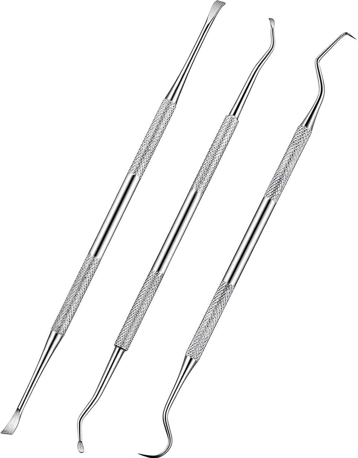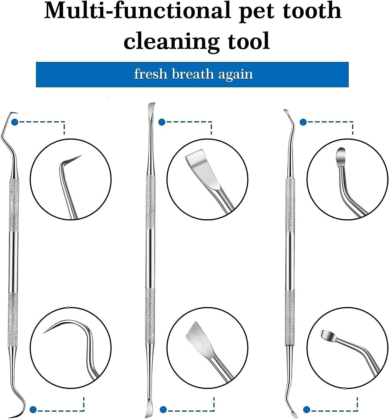 Easy to use: the tooth scraper and scaler both ends have a descaler set at a different angle, can reach different spots, and it doesn't take much pressure to scrape tarter came off easily; Usage steps: firstly, predict the depth and shape of periodontal position with a bending probe, quickly clean the food and residues, then remove the surface dirt with a dental stain removing tool, and finally clean the calculus on the raised gingiva with a hoe cleaner10Save time and energy: pet's tarter removal for routine dog dental care will save lots of energy in the long run by not having to have dental on our lovely pets as often and the pets don't have to face the fear of the doctor neither10Quantity: the package includes 3 pieces of pet teeth cleaning tools, and they are 1 pack of double heads tooth scaler and 2 pieces of double head tooth scraper10Material: the dog dental tooth scaler and scraper are made of stainless steel which is safe for the pets' mouth and they will help you a lot cleaning the teeth of your pets10Warm notice: this product is relatively pointed; You should pay attention to the operation in the process of home use; It is better to have more professional assistance; Pay attention to the size of the product when using it; Not suitable for small dogs; At the same time, keep your hands stable to avoid hurting yourself and dogs