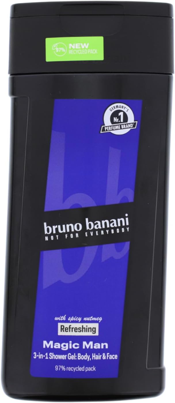 With the bruno banani Magic Man Shower Gel for body and hair, you get an aromatic fragrance rounded off by spicy nutmeg This long-lasting fragrance for him impresses with an unexpectedly nutty spice, underlined by fresh aromatic notes and a modern, woody amber trail. - Heart notes: cyclamen, cocoa wood, pecan, allspice, velvet flower. - Base notes: amber, elegant wood notes, patchouli - Top notes: cardamom, nutmeg, black pepper, incense. - Refreshing. - 3-in-1 shower gel. - 3 x 250 ml. 3 x bruno banani Magic Man shower gel,Nourishing and refreshing,Masculine male fragrance,Fresh and nourished throughout the day