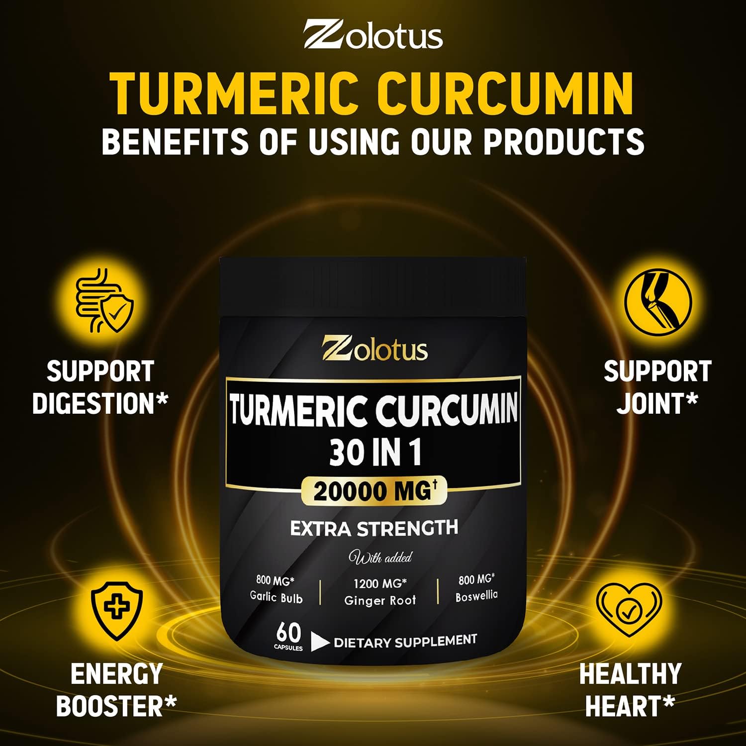 ? Max-Potency : Our Turmeric Curcumin Extract is 95% standardized curcuminoids, Maxium Extract Available on the Market. Other Brands are just using Turmeric powder? Special Formula 20000 mg Per Capsule: That is one of the highest strength Turmeric Curcumin supplements available. Just one Capsule Per Day, give you all the Energy you need for a day long? 30 in 1 : Zolotus Turmeric Curcumin supplements Included Ginger, Garlic Bulb, Bromelain, Moringa, Black Pepper. These powerful ingredients will help you many many health benefits in both men and women? All Natural : Our Turmeric Curcumin Formula is made with the highest-quality ingredients, 100% Natural, Vegan, Non-GmO, Gluten-free, No fillers, preservatives, binders, or harmful chemicals? High Quality Products : All Zolotus Products are third-party tested and formulated in the Usa in a Gmp certified facility to ensure its authentic and sustainable manufacturing process. If for any reason you are not satisfied, feel free to contact us for a pleasing resolution