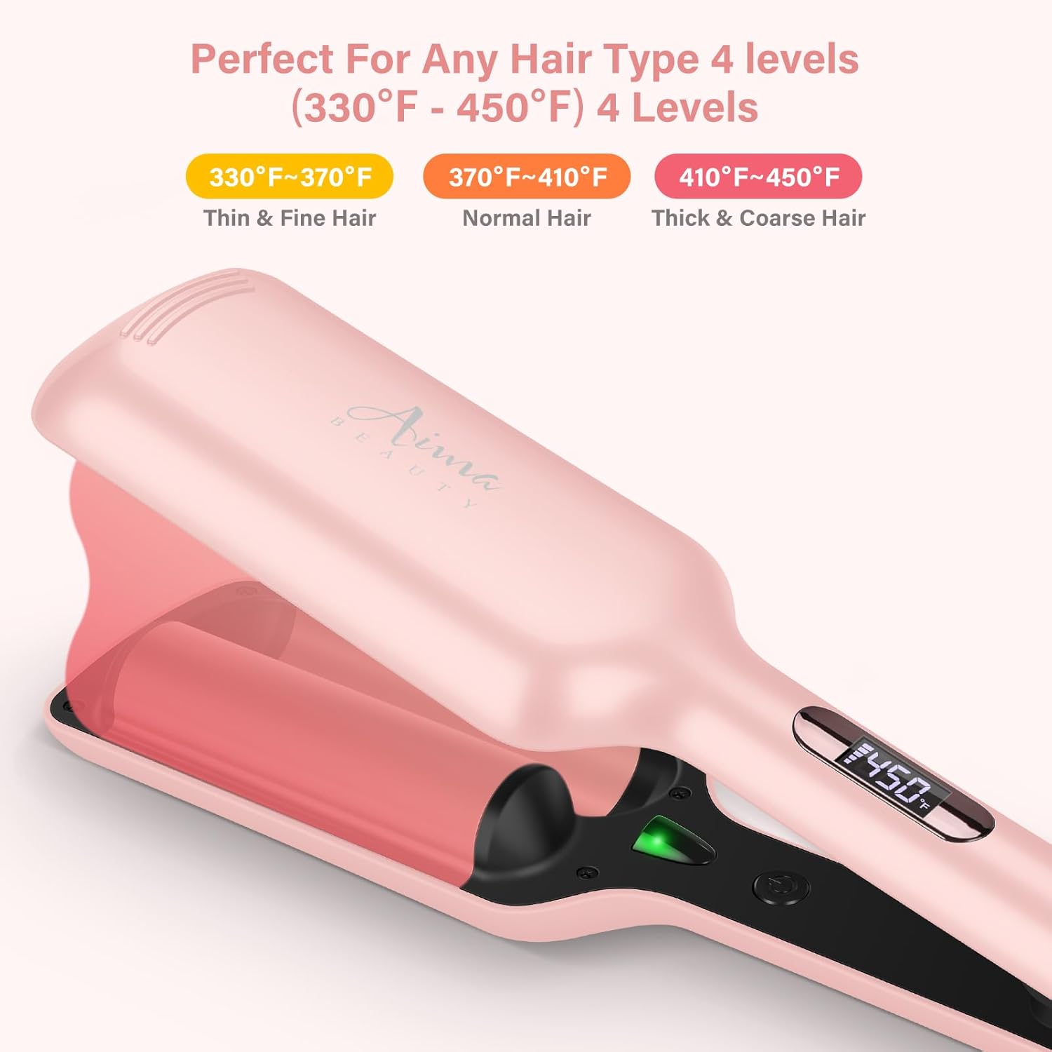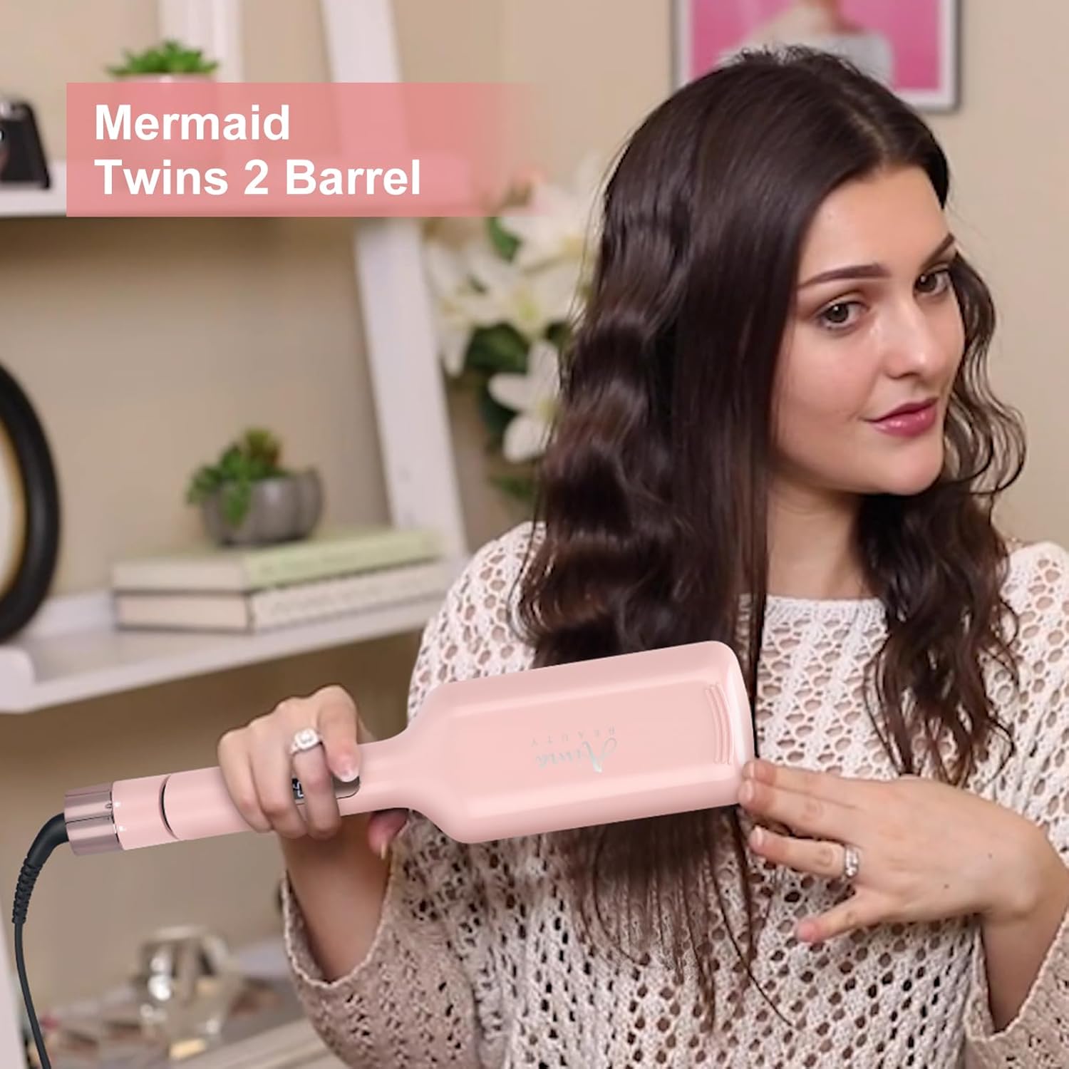 About this item Create Mermaid Big Shallow Waves -Hair Waver Instantly create Mermaid Big Shallow Waves without experience, be friendly for beginners, long-lasting hairstyle that stays for the whole day. Before make waves hair style,please comb straight your hair well first to get better effect ( If you hear a sizzling sound in quiet environment, it is ionic outlet is emitting negative ionic. The product is normal, please be assured use it ) Anti-Scald Protect Shell - This double barrel hair crimper ceramic tourmaline heating barrel inside the shell, anti-scald, you don't need to worry about burning fingers, the face etc. Nice For All Hair Type Perfect Gift Option - Twins mermaid wave wand is suitable for short, medium and long hair, all can be made mermaid waves. Ionic emitter releases negative ions, neutralizes static electricity in hair, keeps hair supple, and locks hair moisture at the same time, lasting moisturizing. It is a good choice for sending gifts to your lovers, friends for holiday,birthday etc. Adjustable temperature - This curling iron has 4 levels of temperature (330°F, 370°F, 410°F, 450°F) for adjustment, choose the best one for your hair type, no matter coarse, fine, thick or thin hair. (Note: If you see smoke, it is normal and comes from the steam produced by the hair when it is heated. The moisture content of hair varies from person to person.) Safety Lock for Convenient Storage - When the barrel becomes cool, you only need to rotate the safety lock to the lock position for storage. See more product details,Create Mermaid Big Shallow Waves -Hair Waver Instantly create Mermaid Big Shallow Waves without experience, be friendly for beginners, long-lasting hairstyle that stays for the whole day. Before make waves hair style,please comb straight your hair well first to get better effect ( If you hear a sizzling sound in quiet environment, it is ionic outlet is emitting negative ionic. The product is normal, please be assured use it ),Anti-Scald Protect Shell - This double barrel hair crimper ceramic tourmaline heating barrel inside the shell, anti-scald, you don't need to worry about burning fingers, the face etc,Nice For All Hair Type Perfect Gift Option - Twins mermaid wave wand is suitable for short, medium and long hair, all can be made mermaid waves. Ionic emitter releases negative ions, neutralizes static electricity in hair, keeps hair supple, and locks hair moisture at the same time, lasting moisturizing. It is a good choice for sending gifts to your lovers, friends for holiday,birthday etc,Adjustable temperature - This curling iron has 4 levels of temperature (330°F, 370°F, 410°F, 450°F) for adjustment, choose the best one for your hair type, no matter coarse, fine, thick or thin hair. (Note: If you see smoke, it is normal and comes from the steam produced by the hair when it is heated. The moisture content of hair varies from person to person.),Safety Lock for Convenient Storage - When the barrel becomes cool, you only need to rotate the safety lock to the lock position for storage