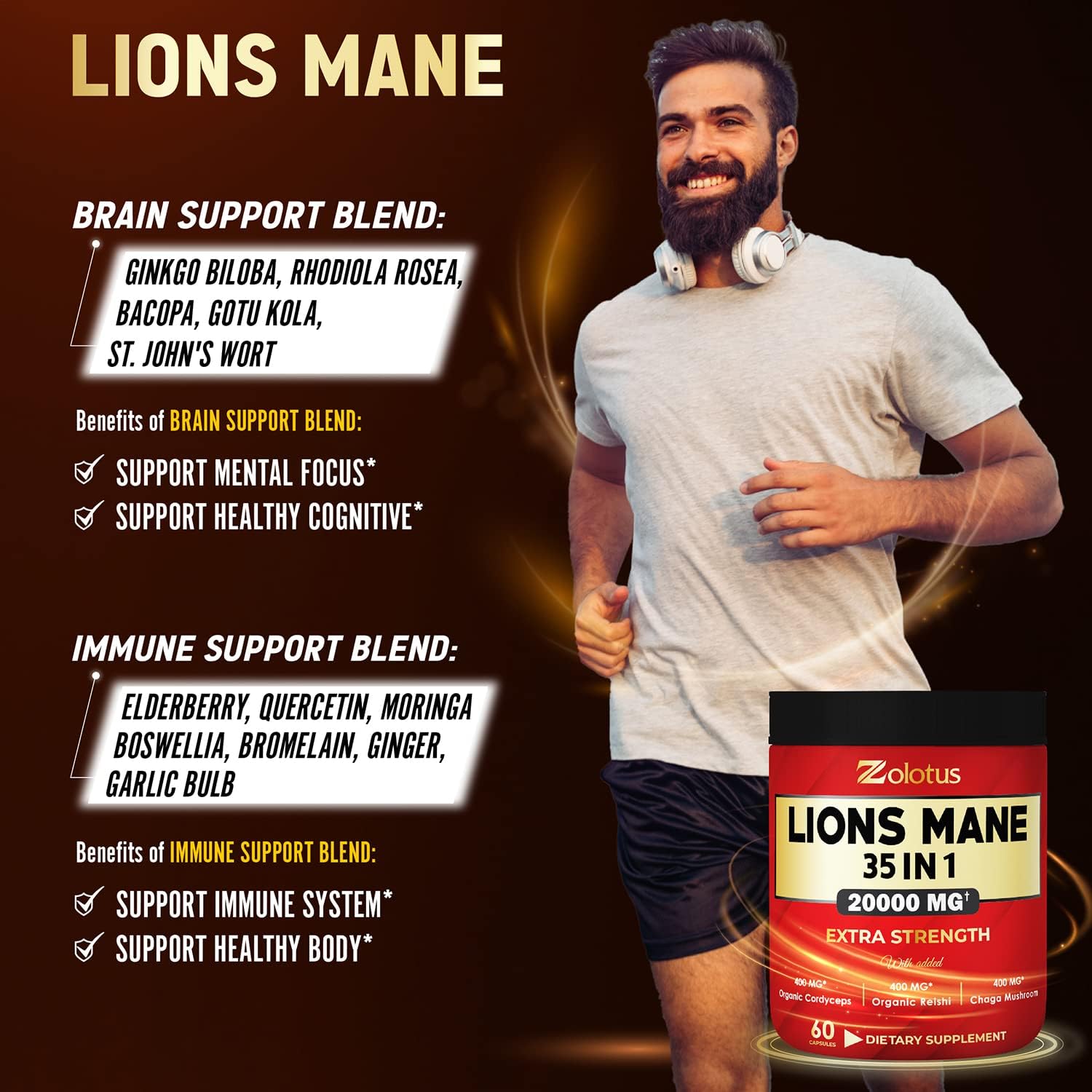 35 In 1 Lions Mane Mushroom Capsules, Equivalent To 20000Mg, With Cordeyceps, Reishi, Elderberry, Ashwagandha, Panax Ginseng - Focus, Memory And Brain Support Supplement, Immune Support, Energy Pills