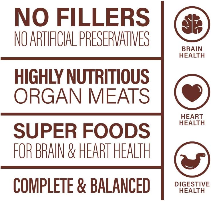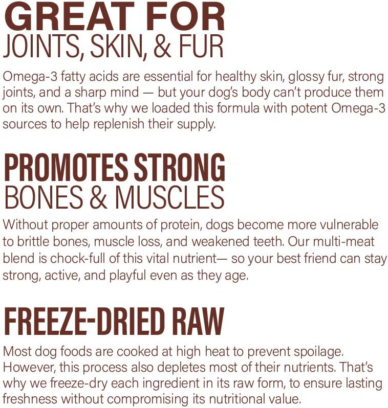 SUPPORTS OVERALL HEALTH - When it comes to keeping your dog healthy and active, nothing is as essential as nutrition. That’s why our wholesome dog food features nothing but carefully sourced animal protein and nourishing fruits and vegetables, and is proudly made in the USA!10NUTRIENT DENSE - Our meal is rich in omega 3 fats, to keep your pup’s joints comfortable, their muscles strong, and their coat shiny and healthy10PACKED WITH GOOD STUFF - Our formula is chock-full of protein, a vital nutrient, to promote strong bones and muscles, so your best friend can stay healthy10HIGH QUALITY INGREDIENTS - We pride ourselves on creating high quality food, treats and supplements the right way. That means no added grains, cereals, fillers, or artificial preservatives — just 100% nutritional support10ALL NATURAL - Our meal is made from pure, natural ingredients, which are freeze-dried raw in their natural form — without fillers, grains, or cereals. It’s nutrition, as nature intended