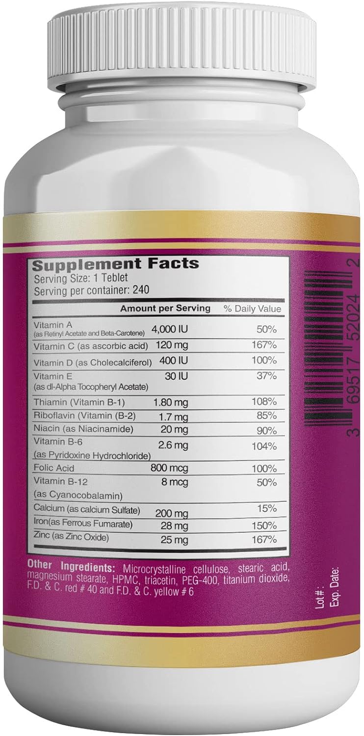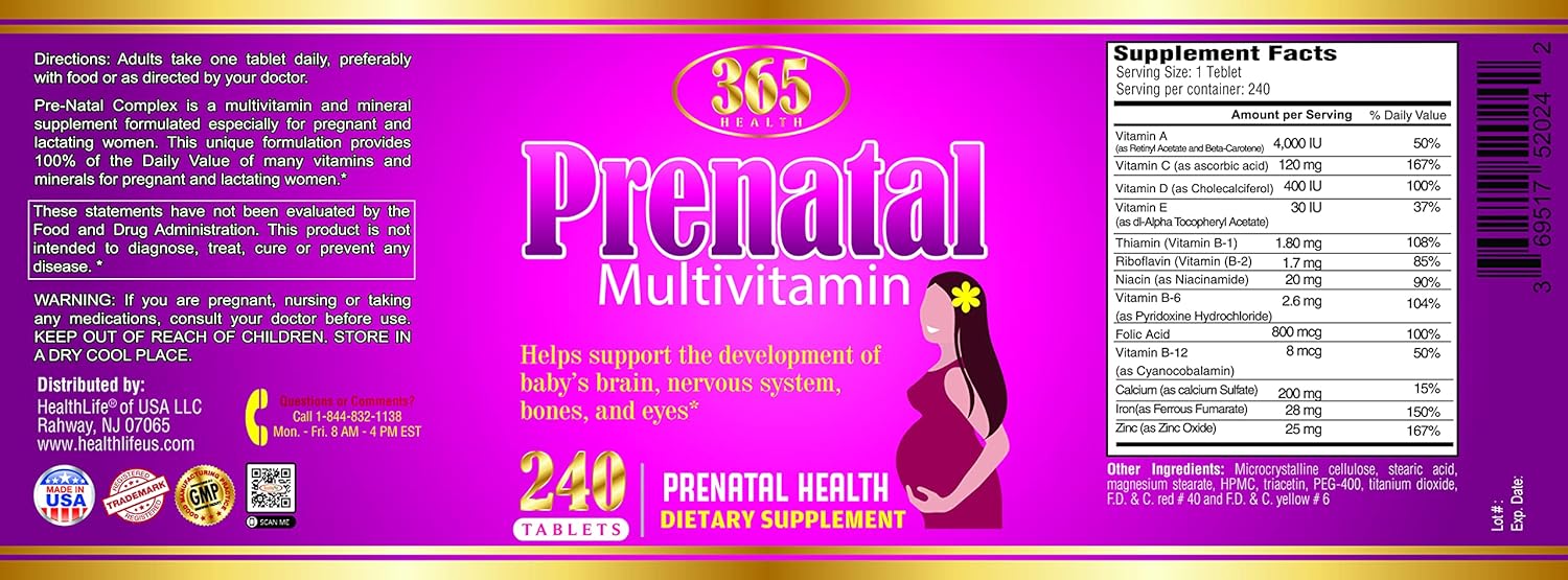 Prenatal nutritional support supplement: contains one 240 count bottle of 365 Health Prenatal Multivitamin with Folic Acid Tablets for a 240-day supply This 365 Health Prenatal Multi contains Folic Acid and 17 other nutrients to support baby development and mom's health, including Zinc, B Vitamins, and Vitamin A, Vitamin C, Vitamin D, and Vitamin E This 365 Health women's multivitamin is a prenatal multivitamin supplement that supports a baby's brain health, bone health, eye health, and nervous system Adults take one of these 365 Health multi prenatal tablets daily with water and a meal This 365 Health multivitamin supplement for women is gluten free and contains no artificial flavors.
