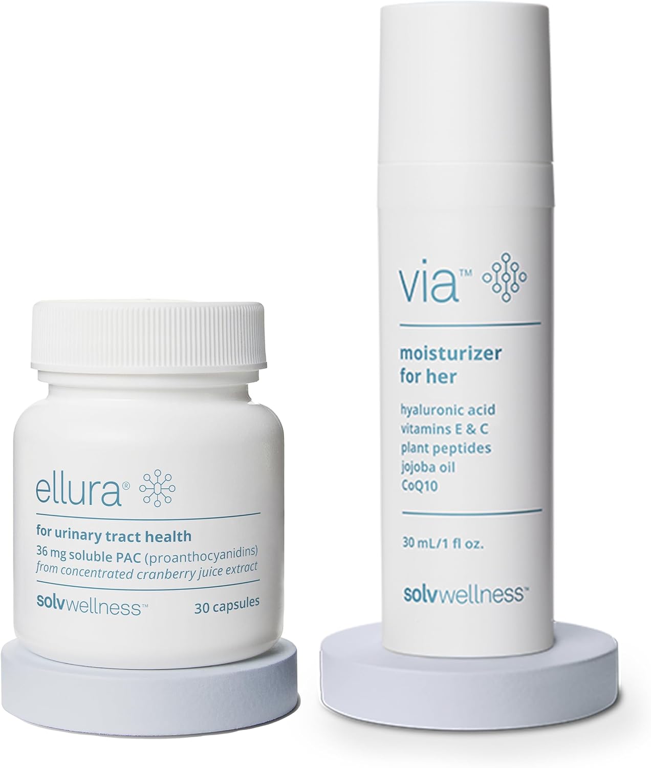 [About The Bundle]Rather than just mask symptoms of dryness, Via moisturizing serum helps treat the underlying issue of vaginal dryness, and Ellura cranberry supplement helps get ahead of UTIs. Together, they help encourage a well-balanced female pelvic region for maximum comfort. [About Via] Our water-based vaginal moisturizing serum is hormone-free and fragrance-free and works with the body to encourage long-lasting hydration. Hyaluronic acid is the primary active ingredient, but the formulation includes other state-of-the-art, science-backed ingredients to maximize delivery of all ingredients and promote hydration: jojoba oil, vitamins E and C, CoQ10, and peptides (amino acids). Unlike lubricants that were designed to sit on top of the skin during extended play, our vaginal moisturizing serum is designed to be absorbed by the skin to help address the underlying issue. It comes in an airless pump, so you can squeeze every last drop from the bottle. [About Ellura] These UTI supplement capsules contain 36 mg of Gikacran which is 100% bioavailable (soluble) PAC taken only from the concentrated cranberry juice extract—the best defense against the most common nasty intruders that cause UTIs. Utilizing PAC from concentrated cranberry juice extract is key to efficacy. [Better Together] When used together, these pelvic health products help women stay comfortable in their own bodies. Causes of UTIs include sexual intercourse, age, and hormonal changes impacting the gut, vaginal, and urinary tract microbiomes. Other known triggers include dehydration, travel, and infrequent urination. Risk for UTIs increases as women age. Via and Ellura by Solv Wellness help address some of the more uncomfortable problems that increase as women age. Our research-based solutions help restore comfort to the female pelvic triangle (gut, vagina, and urinary tract) for all women, and especially for those at midlife and beyond. In addition to the bundle pack, our products are sold individually