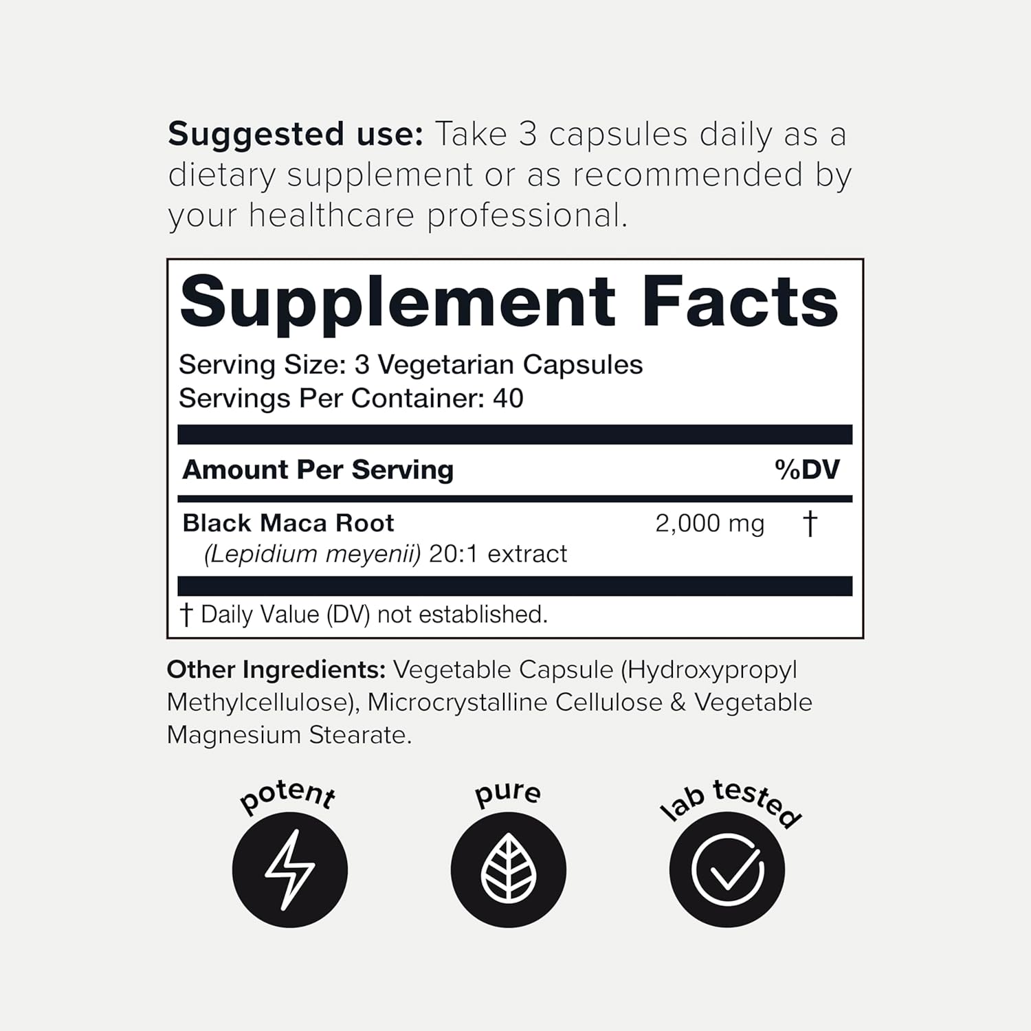 40,000Mg Pure Black Maca Root Extract - Ultra Concentrated 20:1 Single Origin Wildcrafted Third-Party Tested Black Maca Powder Capsules For Men & Women - Peruvian Black Macca Root Powder -120 Veg Caps