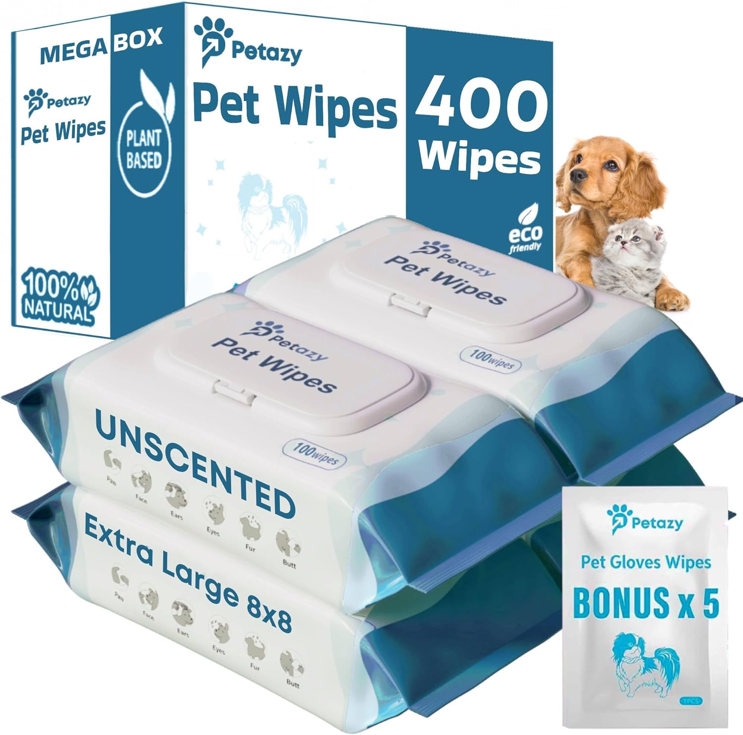 PETAZY PET WIPES FOR DOGS AND CATS - Our deodorizing wipes are a fast and convenient way to freshen up your pet and remove all dirt between baths. Use on ears, fur, paws, butt, and around eyes. Tough on the odor, gentle on the pet10100% ORGANIC - Made with only organic ingredients and enriched with soothing avocado, aloe, yucca, and other natural ingredients, Petazy wipes are guaranteed to leave your pet happy and healthy. Hypoallergenic and alcohol free. Soft and gentle for everyday use104 PACKS OF 100 - 400 WIPES - Conveniently packed in 4 packs of 100, our wipes are easy to carry with you and store a pack wherever necessary. The flip top lid keeps the wipes moist and fresh. The extra large size prevents you from using too many wipes10EXTRA LARGE WIPES UNSCENTED- A great grooming experience for daily hygiene, Unscented wipes will leave your pet friends smelling their best. Perfect for travel or everyday use10CUSTOMER SATISFACTION GUARANTEED - If you are not fully pleased with our products, reach out to us and we will help you. No questions asked. From A to Z, Petazy guarantees your satisfaction!