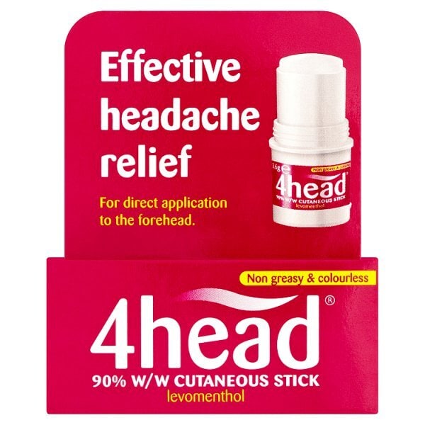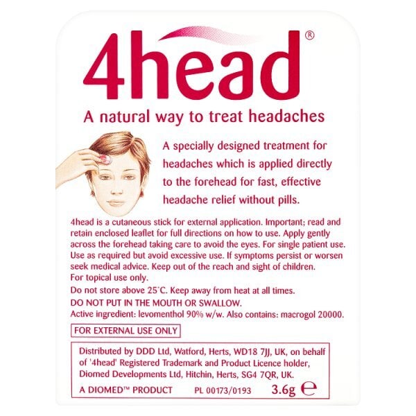 Product Information:4head is specially designed to be applied directly to the forehead for fast, effective relief of headaches ? precisely where it's needed,Features:4head comes as a compact dispenser ? about the size of a lipstick ? is convenient for use whenever a headache creeps up, whether at work, home or on the move. 4head can be used by adults, children and the elderly,Benefit:4head is a completely different way to deal with headaches. Containing the naturally occurring active ingredient levomenthol, 4head avoids the most common side-effects associated with oral analgesics. It brings fast, effective relief, and is suitable for all age groups. Perhaps even more importantly, 4head is applied directly to the forehead, targeting the pain relief just where it is needed,Warning or Restrictions:For topical use only. Do not put in the mouth or swallow. Use as required but avoid excessive use and avoid the eyes. Keep out of reach and sight of children,Product Specification:Levomenthol (90% W/W), Macrogol 20000,Product Uses:Simply apply gently to the forehead. No need for water and it is invisible to the eye when applied,Recyclable:Recycle outer carton